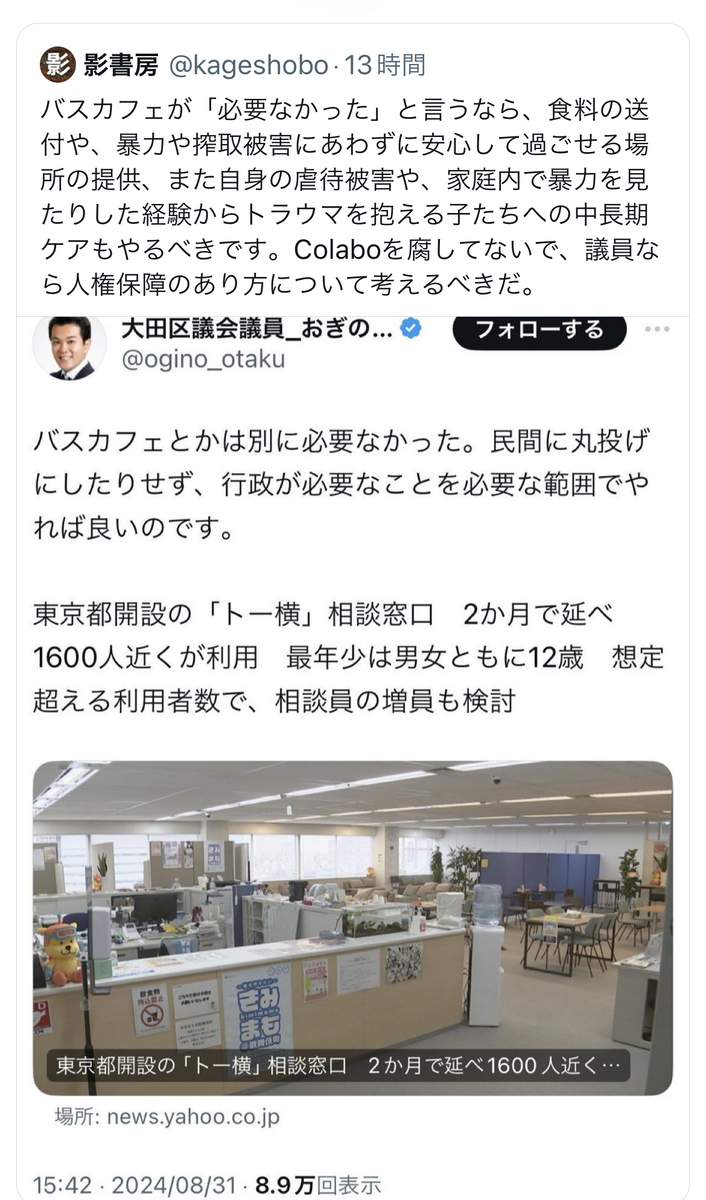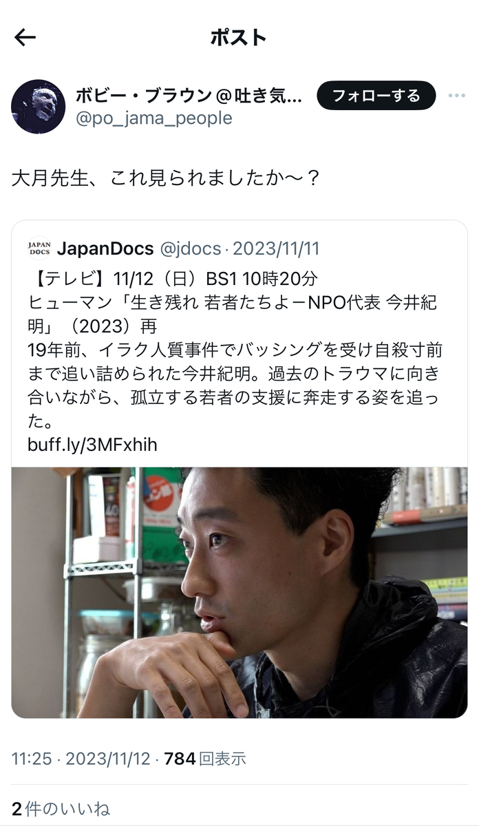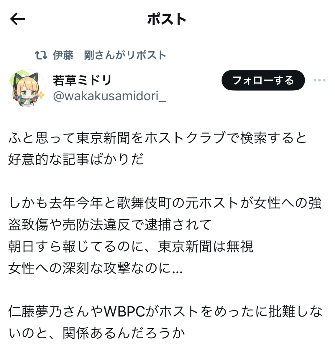 それにしても、専門学校時代から師弟関係を結んでいる伊藤氏ご本人はもとより、大月隆寛氏まで、常日頃のフェミ・リベラルへの舌鋒鋭い言及に比べると、おぎの氏の反社勢力への口座不正譲渡事件、高齢者に対する寸借詐欺疑惑等の追及が……って、おや、誰か来たようです。