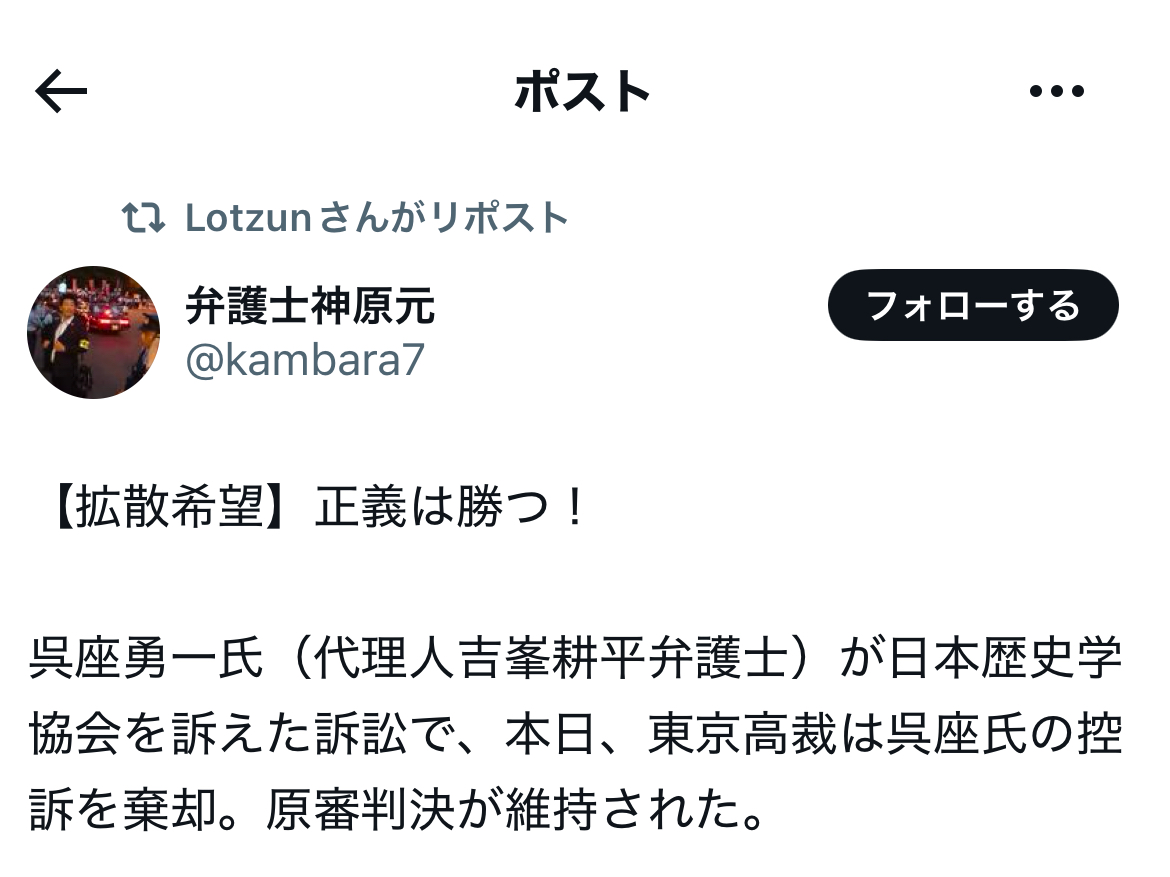 呉座勇一氏(代理人吉峯耕平弁護士)が日本歴史学協会を訴えた訴訟で、本日、東京高裁は呉座氏の控訴を棄却。原審判決が維持された。 pic.twitter.com/LiaeheukmH