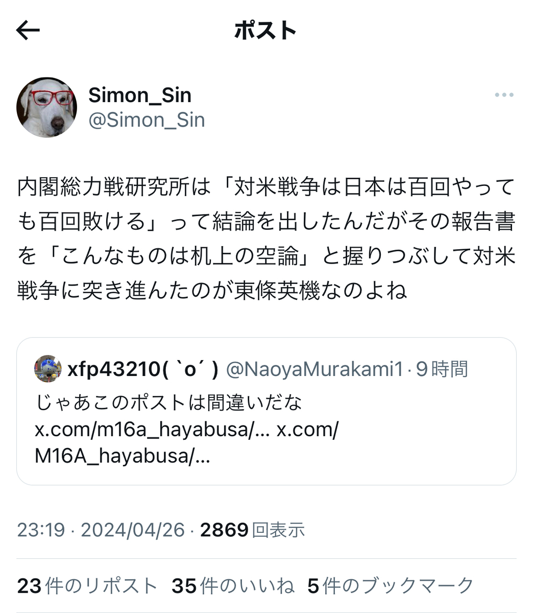 Simonさんが仰られている通り、NHKの朝ドラ『虎に翼』にも登場した首相直属の研究所(現在でいうところのシンクタンク)でもあった「総力戦研究所」は……太平洋戦争の直前、「日本必敗」の結論を出して、当時の日本政府首脳(首相・近衛文麿、陸相・東條英機ら)に報告していたのは、歴然たる史実です。