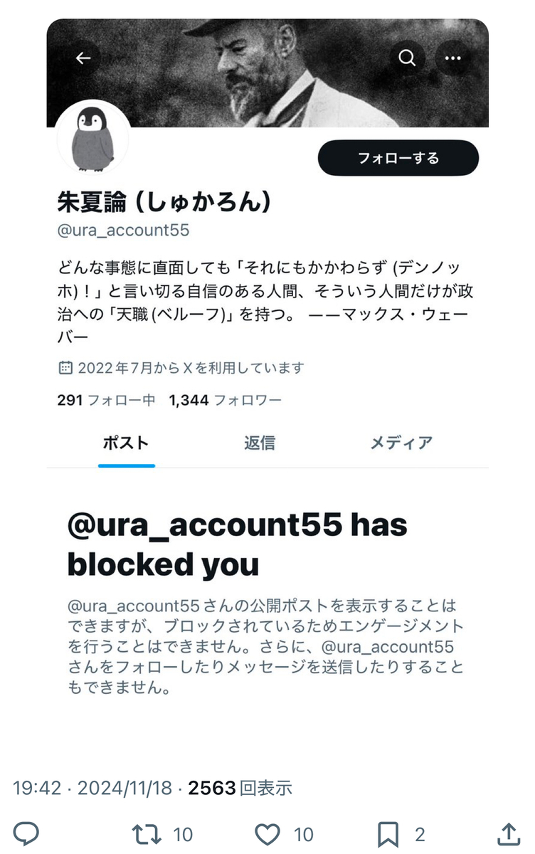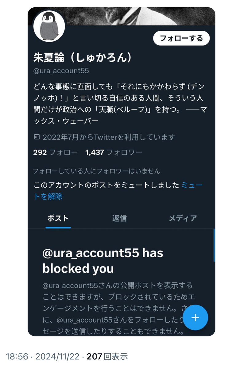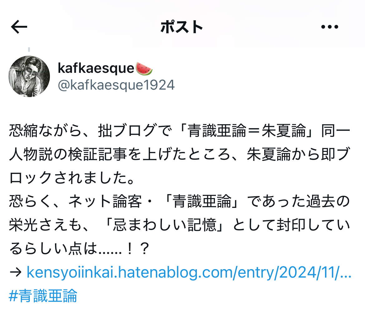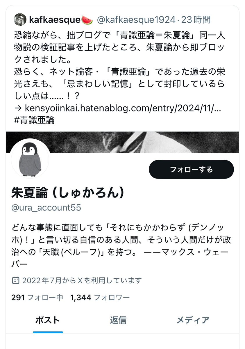 【朱夏論】として華麗に復活を遂げた青識氏ですが……一部を除いて、自身の正体を告発する方々のことを、片っ端からブロックしている模様です。