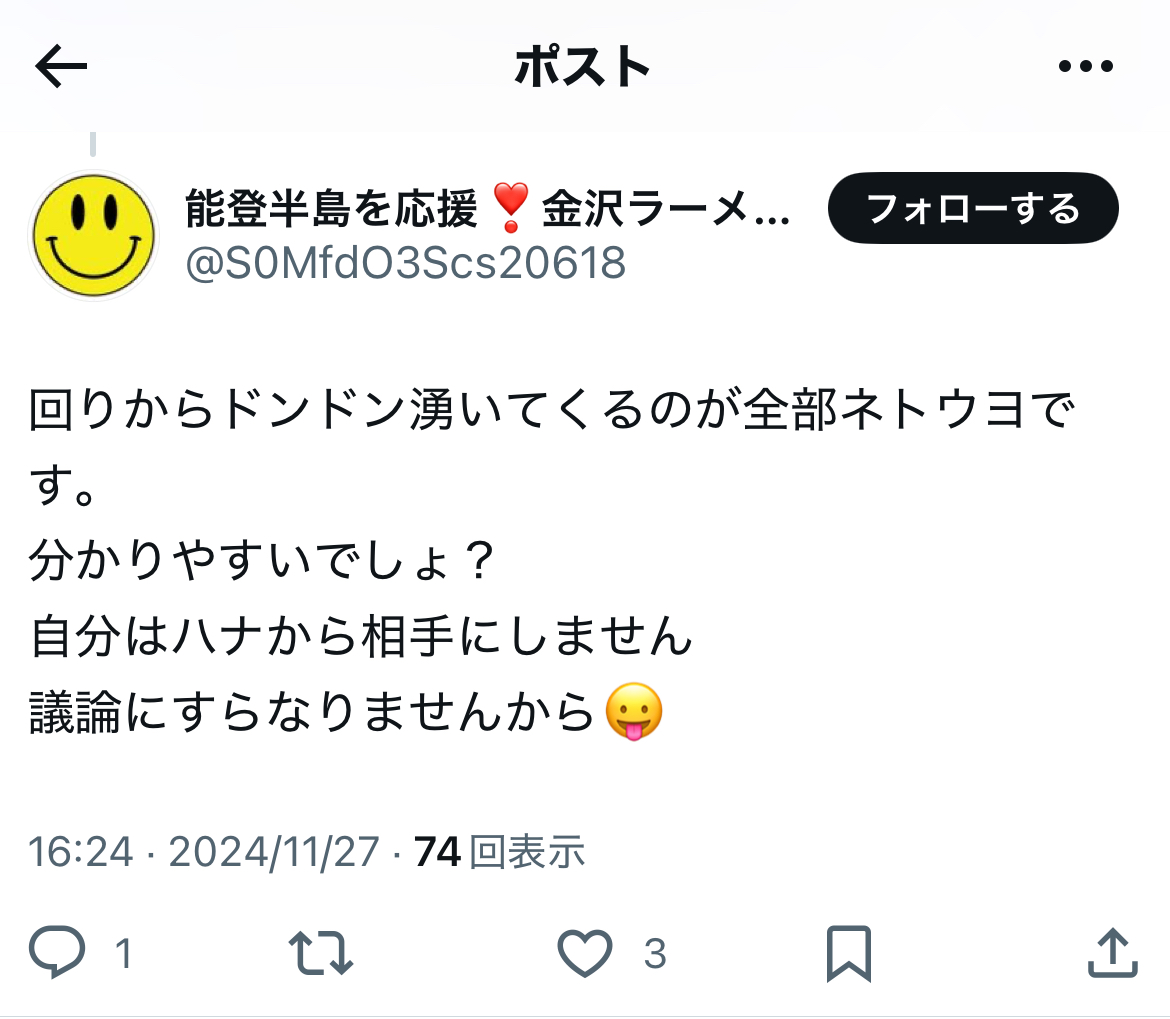 翻って、恐縮ながら、管見の限り……しろちち氏は、能登半島地震の発生時からほぼ一貫して、往年の呉座勇一氏=HN【御座候】を彷彿とさせるような華麗なる「ネット軍師」仕草をご披露していました。