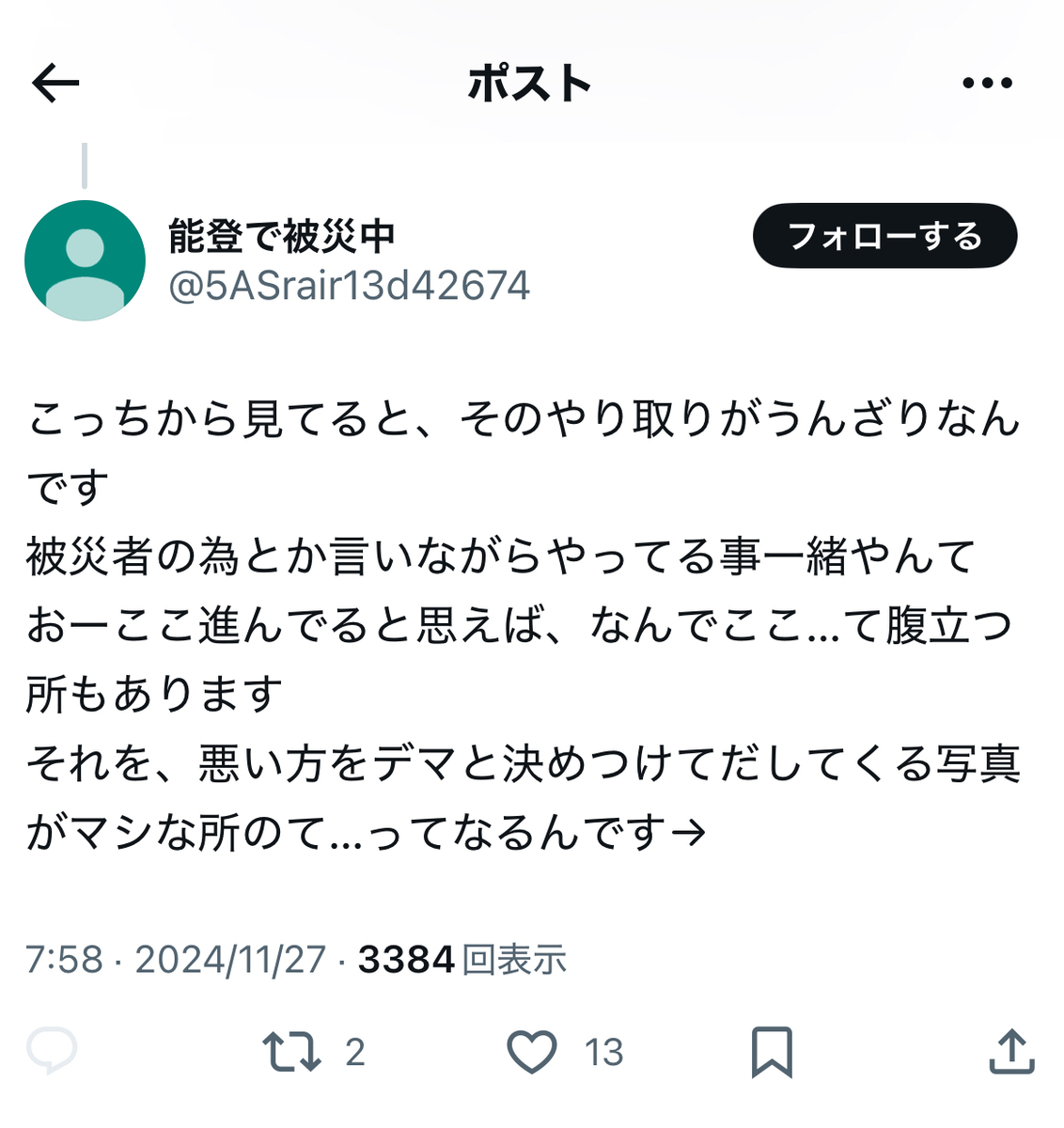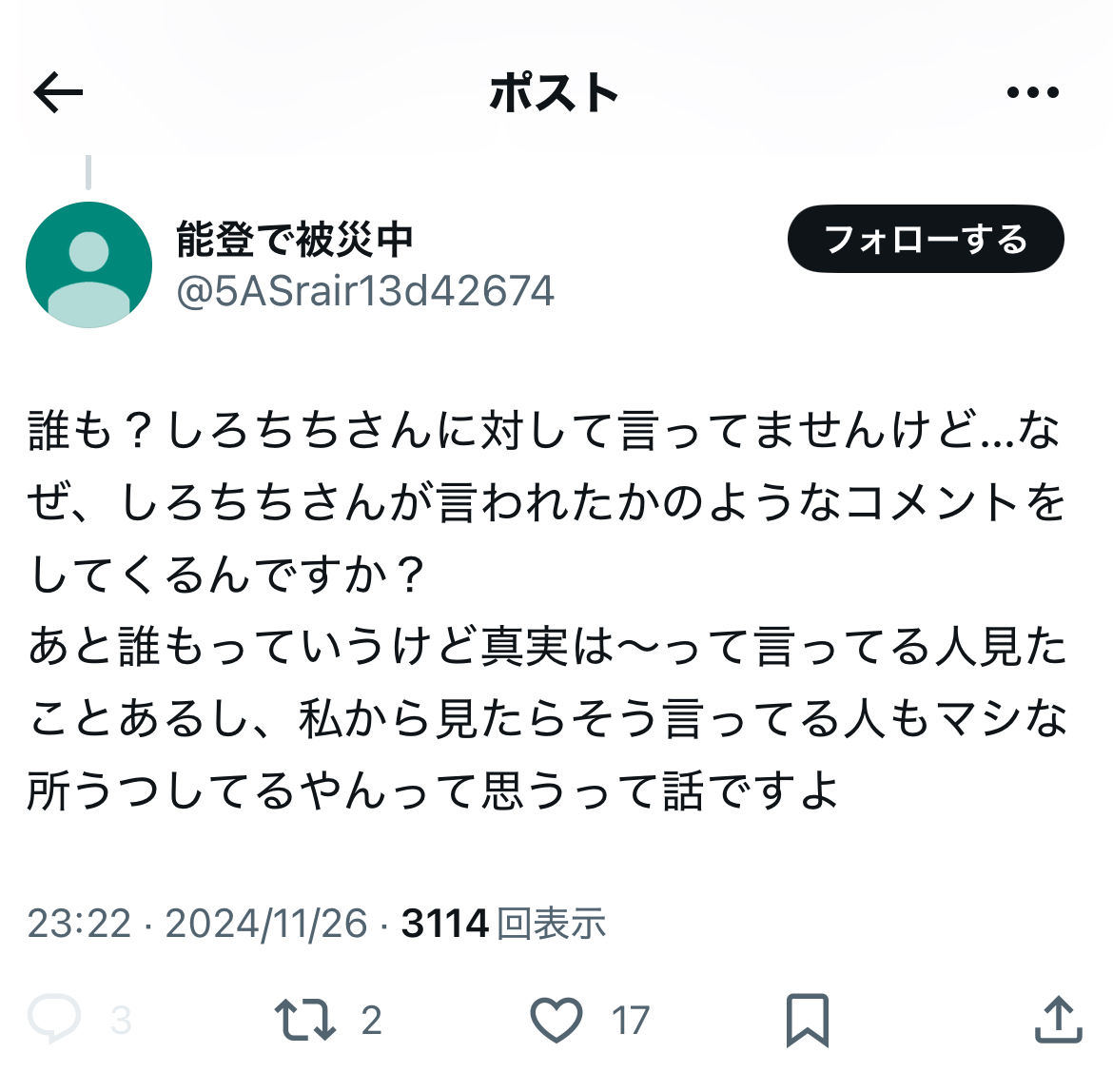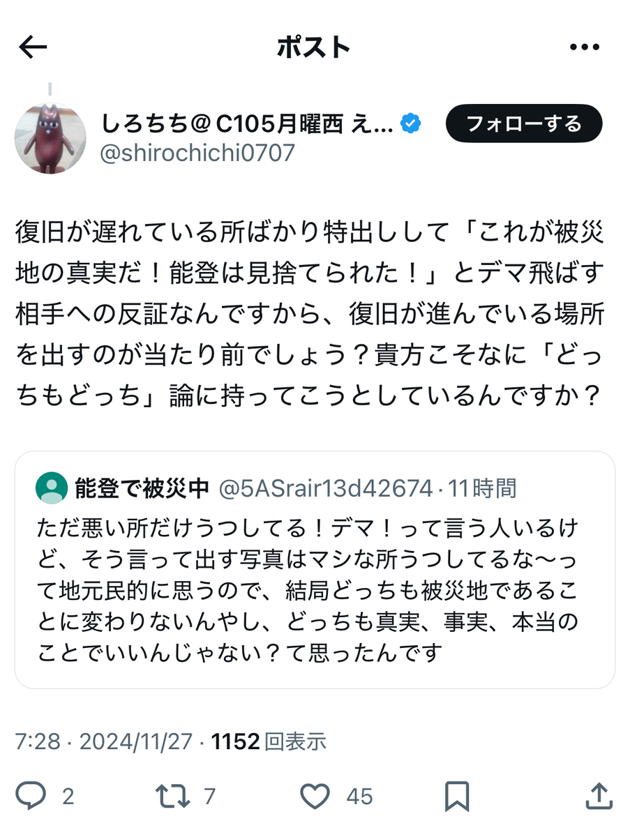 こうした中で、今回起きたしろちち氏による「被災者非難」めいた謎のバッシングまがいの言動は……遂にレッドラインを越えつつあるようです。