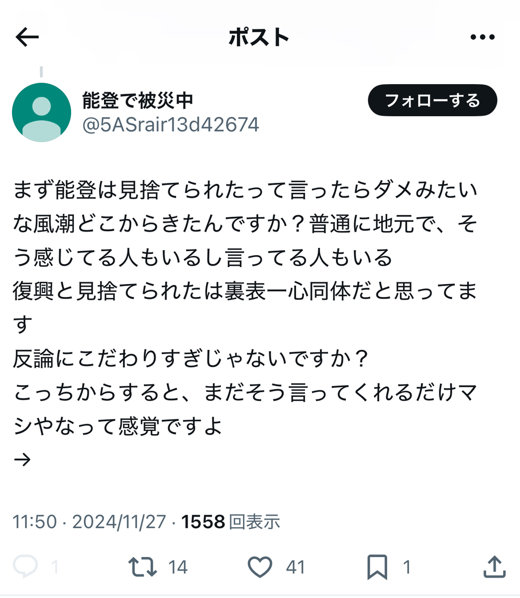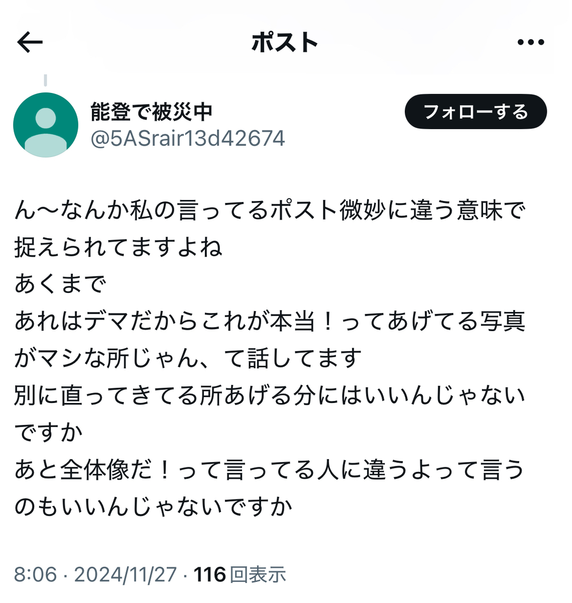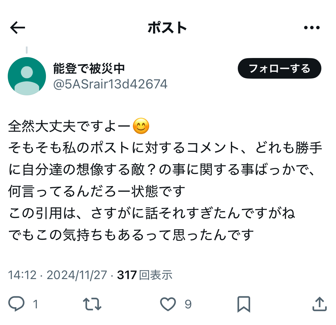 こうした中で、今回起きたしろちち氏による「被災者非難」めいた謎のバッシングまがいの言動は……遂にレッドラインを越えつつあるようです。