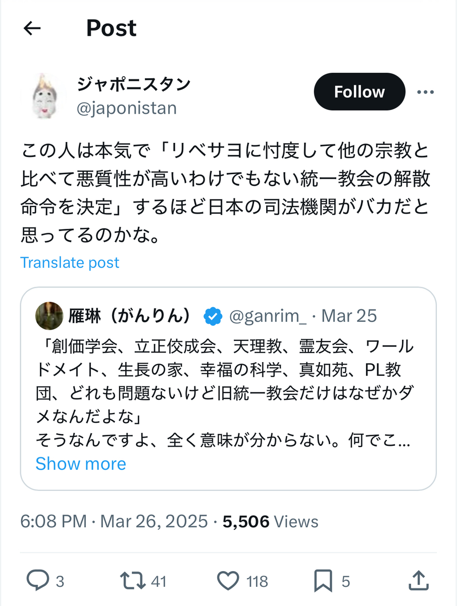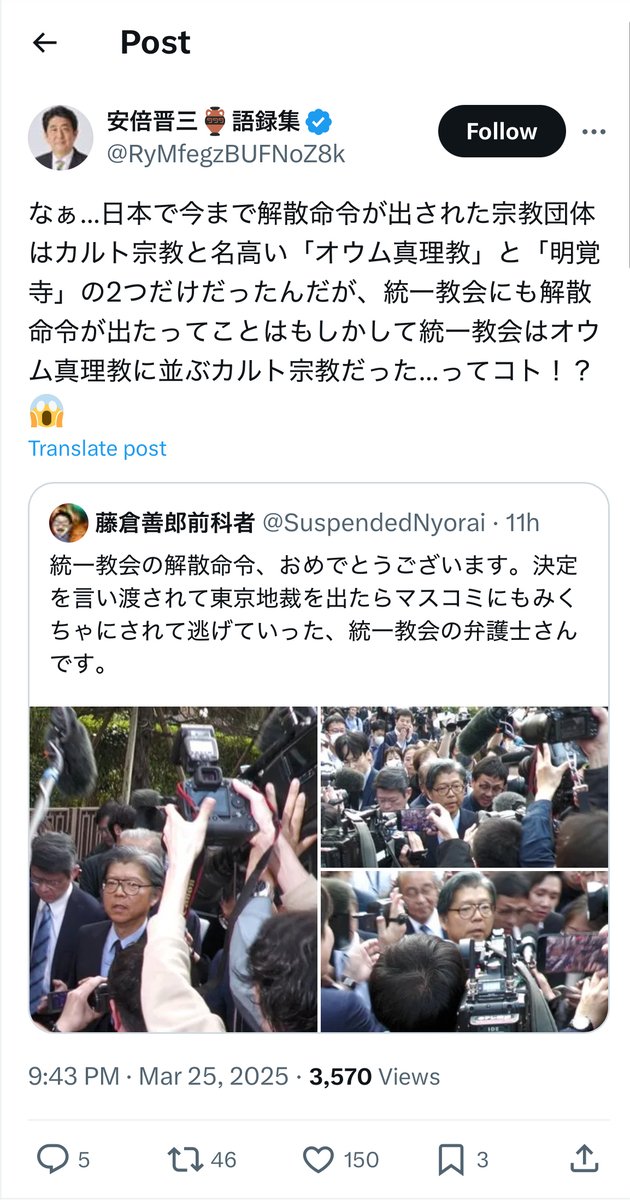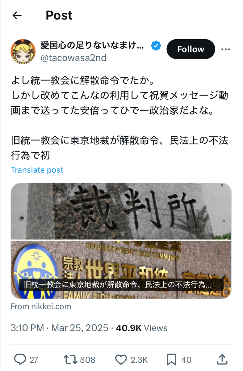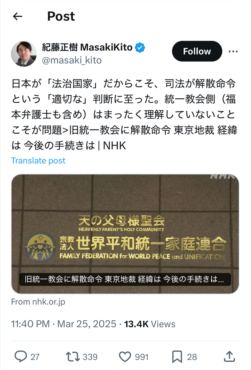 教団への解散命令に喜びを爆発させていた統一協会の元二世信者の被害者の方々とは、あらゆる意味で対照的であったとかと考えられます。