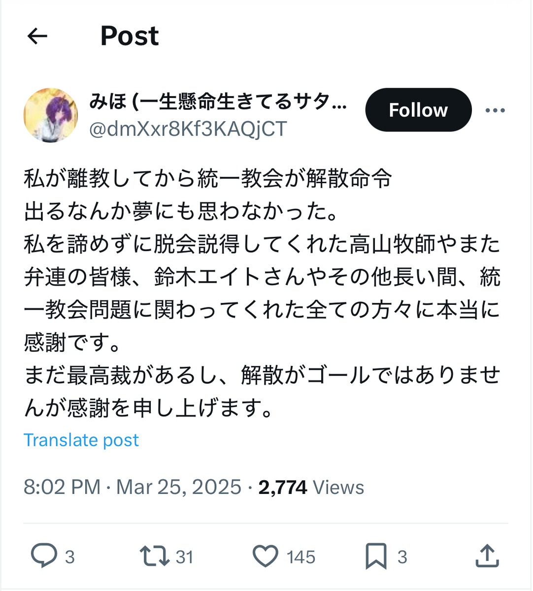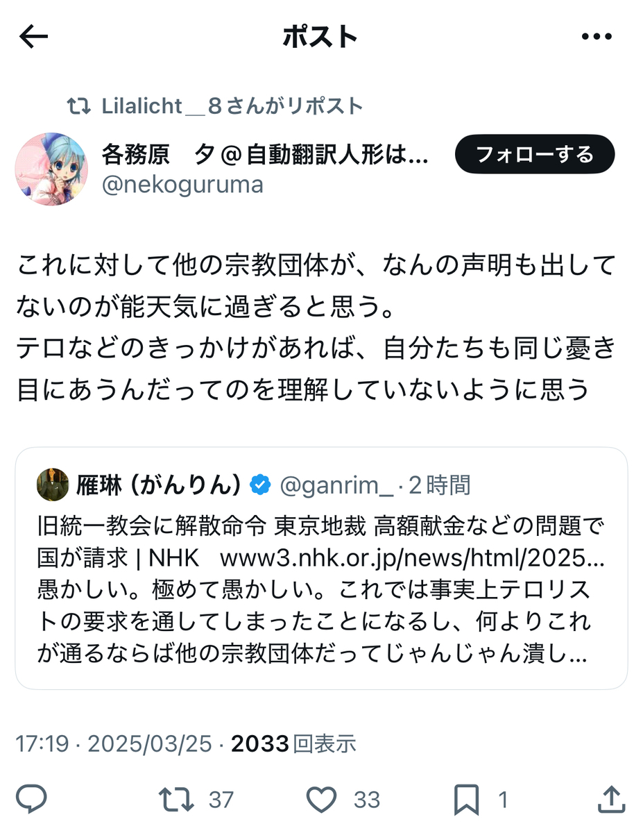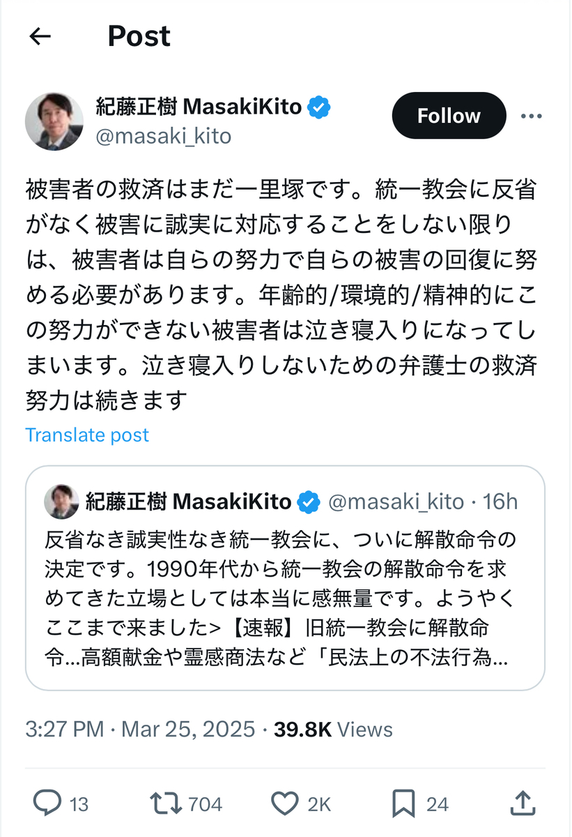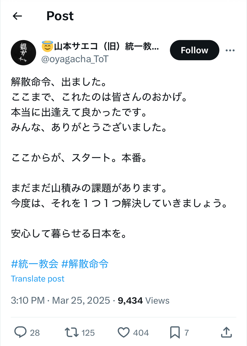 教団への解散命令に喜びを爆発させていた統一協会の元二世信者の被害者の方々とは、あらゆる意味で対照的であったとかと考えられます。