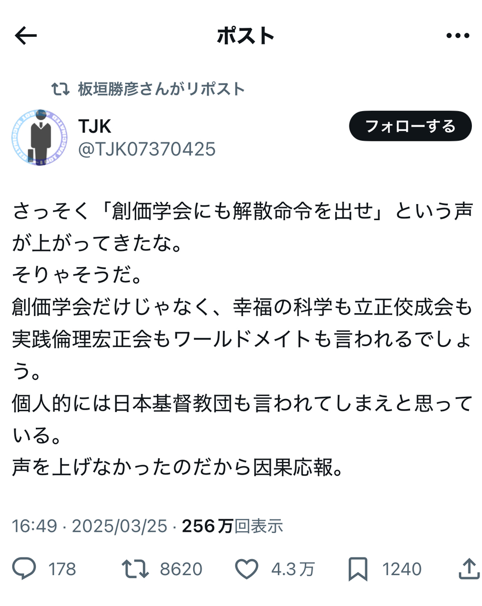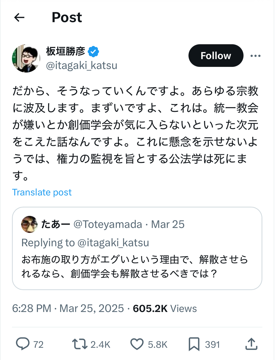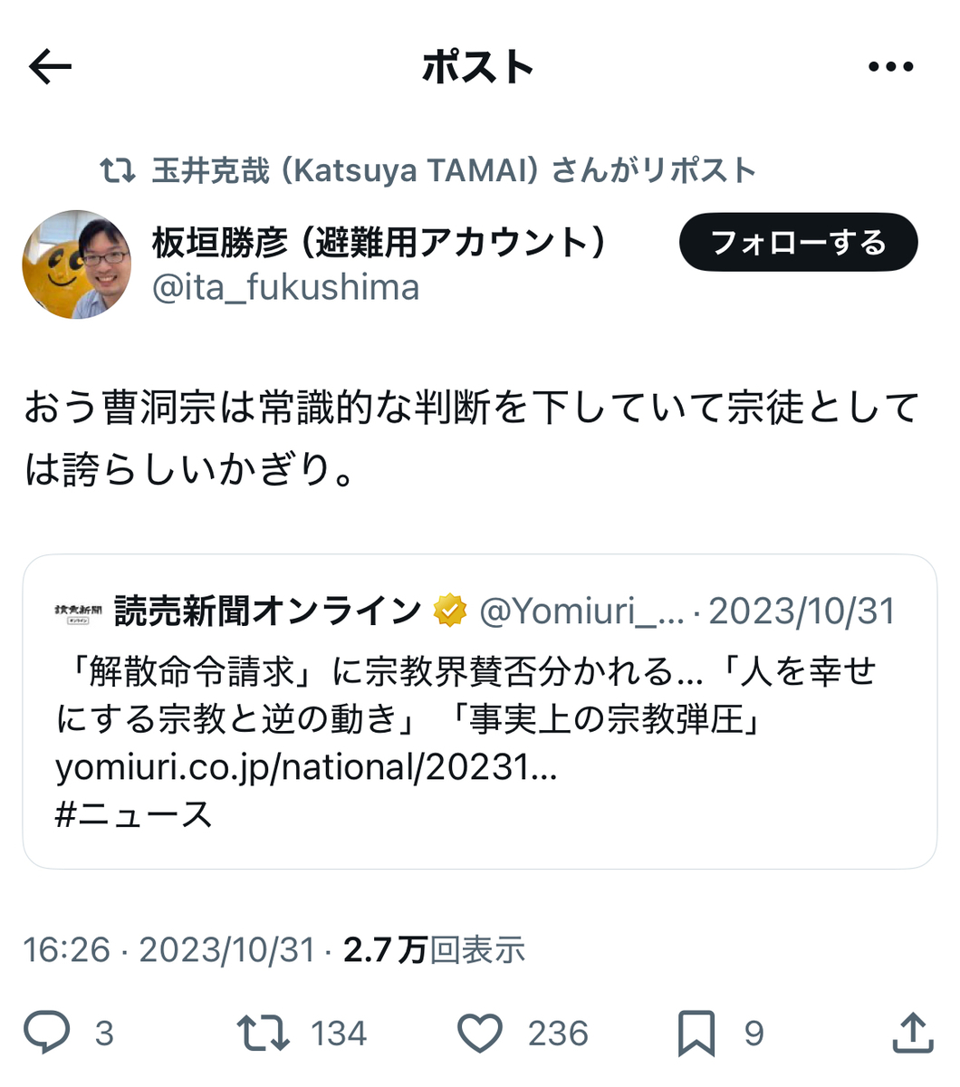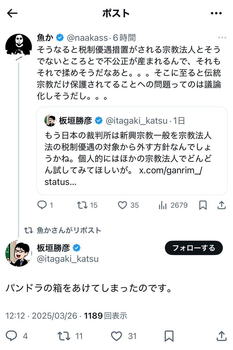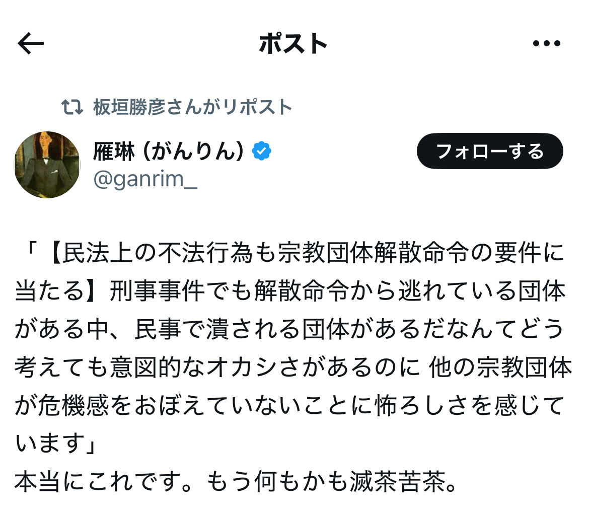 その反オープンレターズのお歴々の間でも……案の定というか、伊藤剛、板垣勝彦、大山格氏らを始めとして、教団への解散命令には猛反発が広がっている模様です。