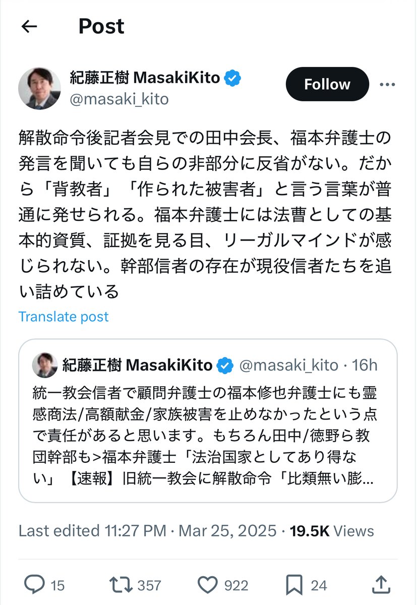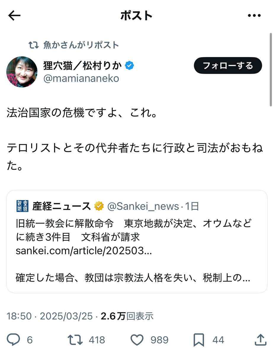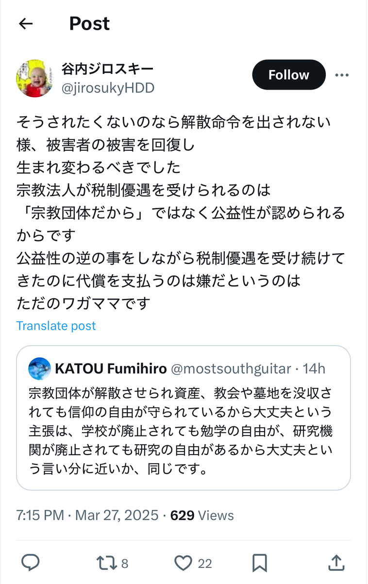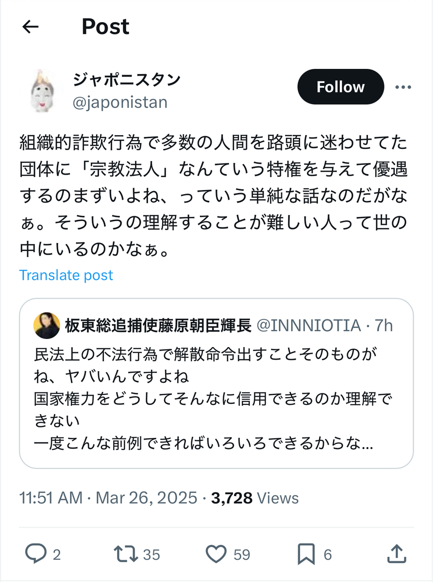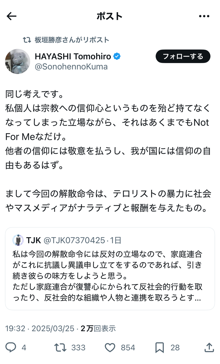 その反オープンレターズのお歴々の間でも……案の定というか、伊藤剛、板垣勝彦、大山格氏らを始めとして、教団への解散命令には猛反発が広がっている模様です。