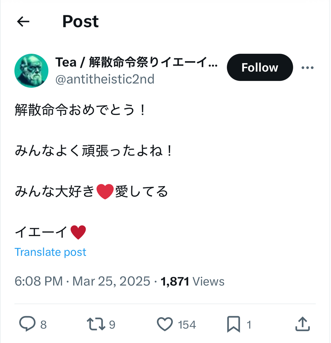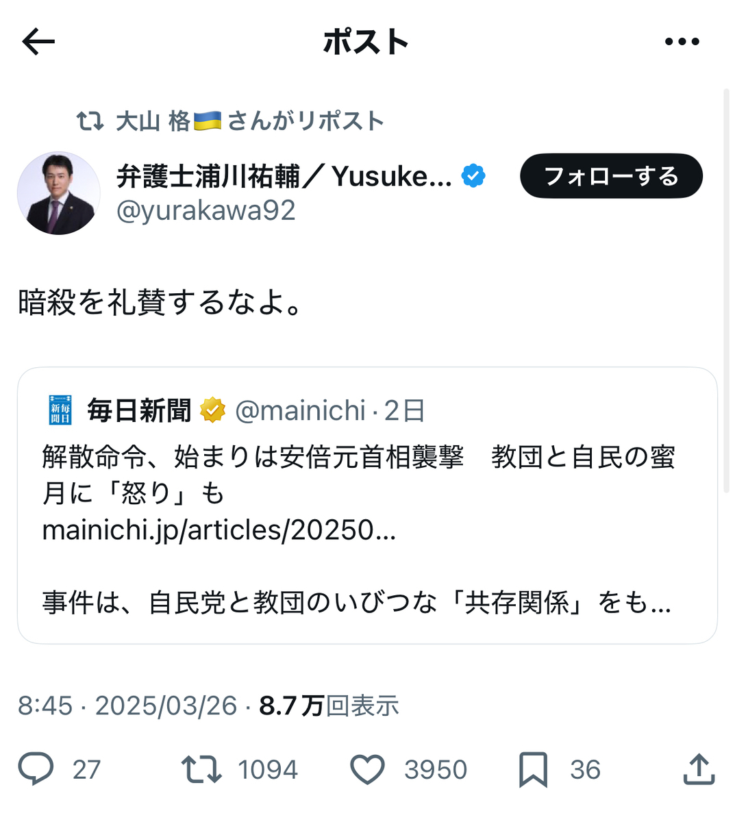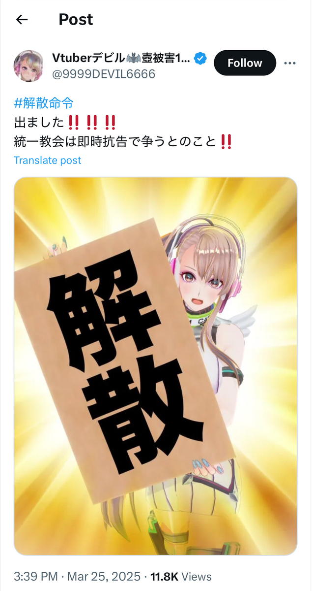 恐縮ながら、自分も教団への解散命令には、無論、「大賛成」であります。 この場をお借りして、解散命令を歓迎していらしゃる統一協会の元二世信者の被害者の皆様方には、祝意を表したいかと存じます。