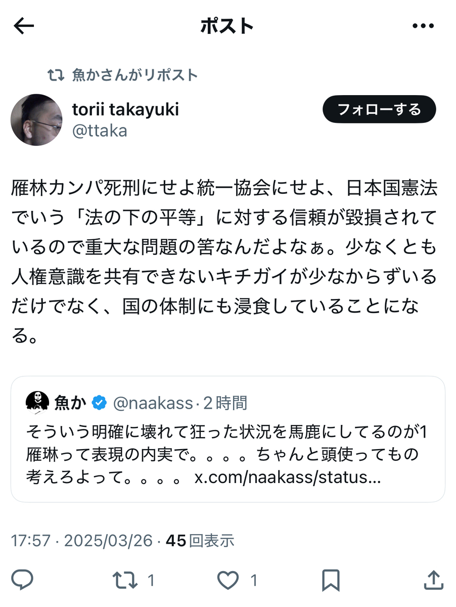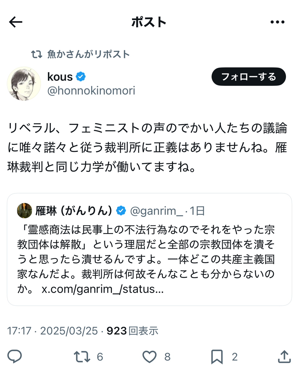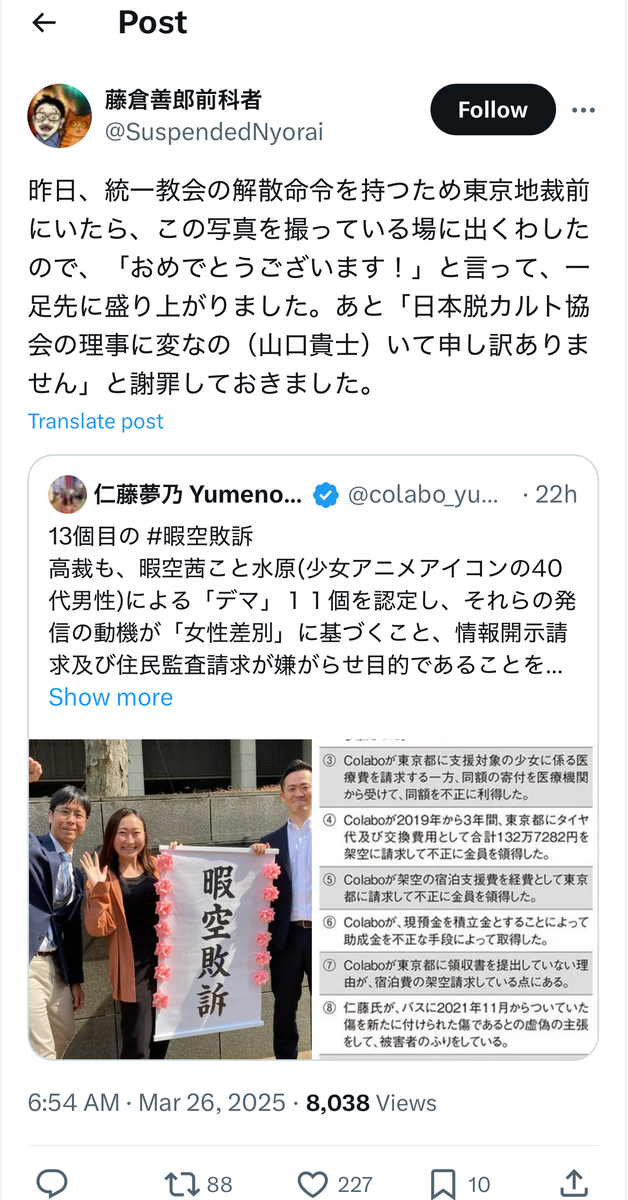 今月末は、期せずして、雁琳氏の上告棄却(全面敗訴確定)、統一協会への解散命令、尊師の起訴等、亀田センセイを筆頭格とする呉座・日本史界隈、伊藤剛・板垣勝彦両氏らの反オープンレターズ「呉座神聖十字軍」、そして大月隆寛(king-biscuit)氏らの暇アノン界隈にとっては……恐らく、悪夢の司法(及び検察)判断ラッシュになったかと存じます。