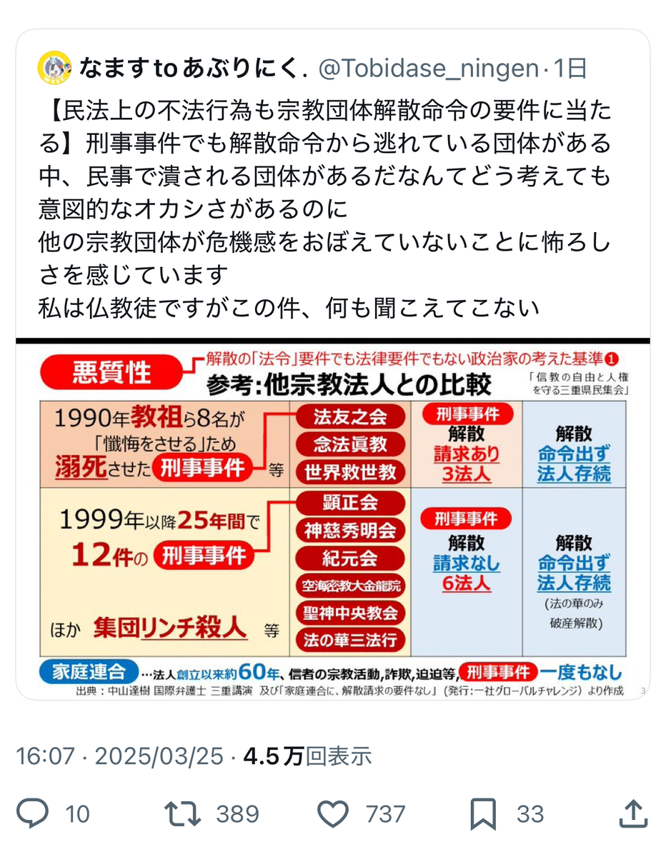 言うまでもなく、宗教法人法に基づく「解散」とは、法人格を失うだけの話であって、その後も任意団体として教団は存続可能です。信教の自由も、引き続き保障されます。