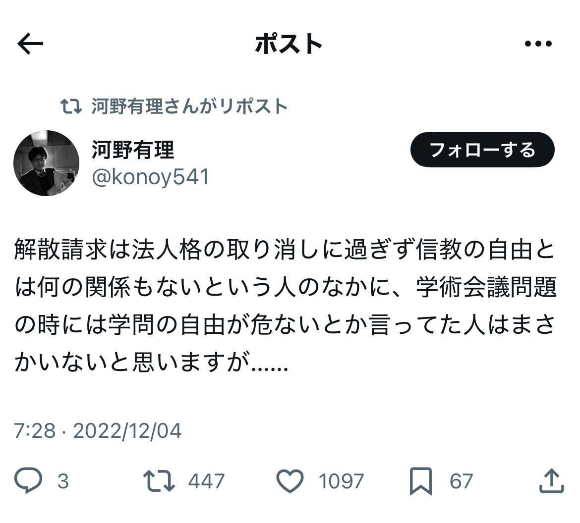 ある意味、お約束の反応と言うか、亀田センセイを筆頭とする反オープンレターズの間では、一部の例外等を除いて、押しなべて、統一協会への解散命令に対しては……