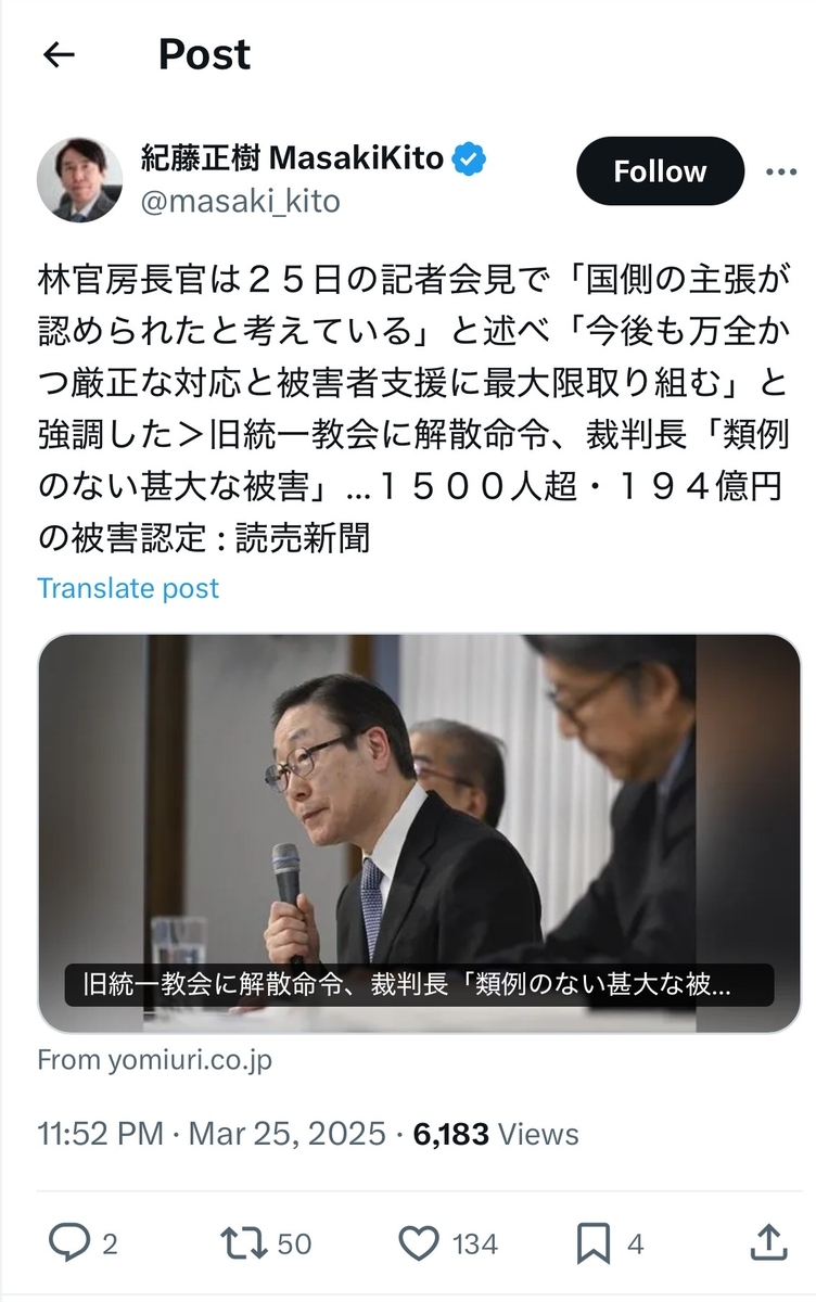 大方の予想通り、この日、東京地裁は統一協会に対し、正式に「解散命令」を出しました。これによって、教団は宗教法人法によって定められた法人格を失うことになります。教団側は即時抗告するとのことですが……多くの識者が指摘しているように、統一協会側に被害者への謝罪や反省もおろか、抜本的な対策も打ち出せないでいる以上、高裁、そして最高裁でも「解散命令」が維持されるのは、ほぼ確実でしょう。