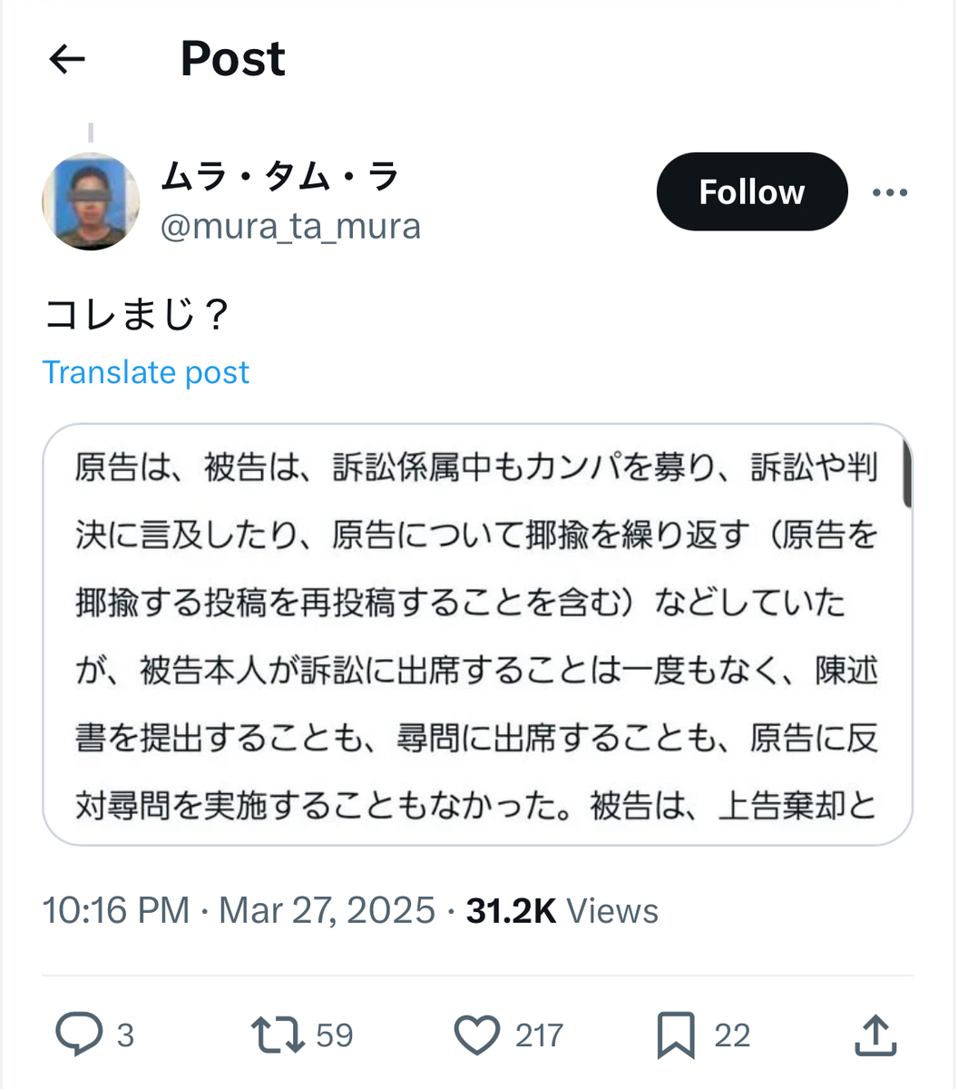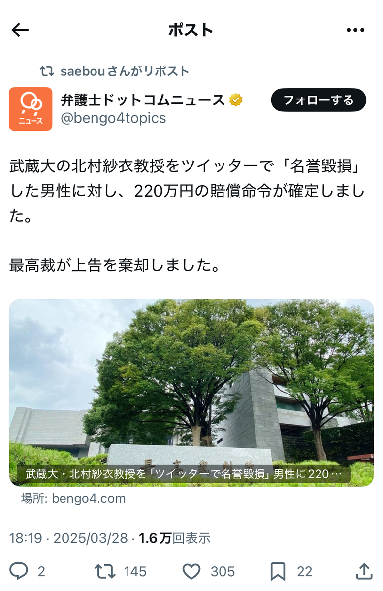 余談ながら、最近の尊師は……対Colabo訴訟の13連敗に続いて、未確認情報とはいえ、Colaboから「名誉毀損」で、フローレンスの駒崎弘樹氏からは「侮辱」等で刑事告訴されていた件等にて、検察から正式に「起訴」されたようです。