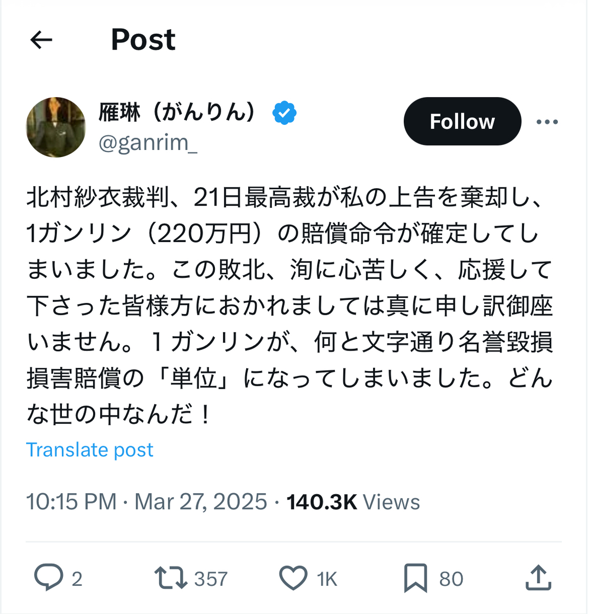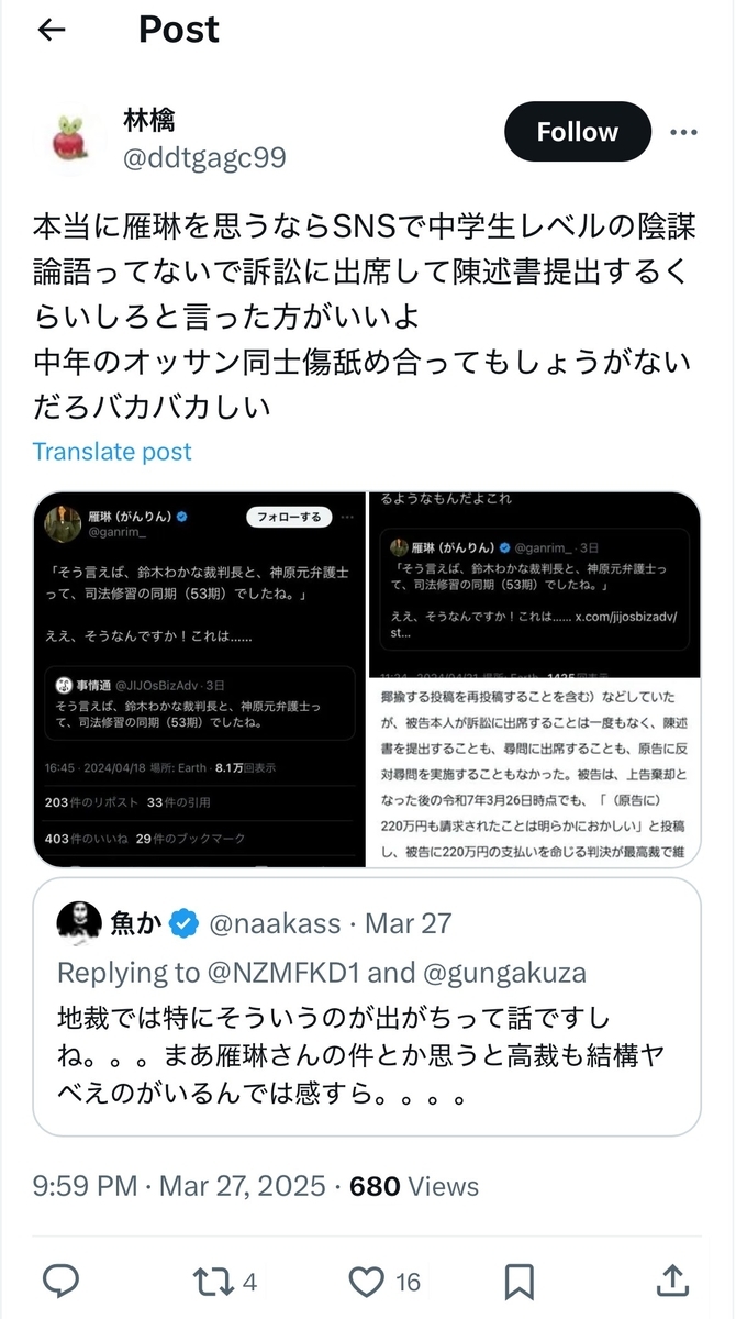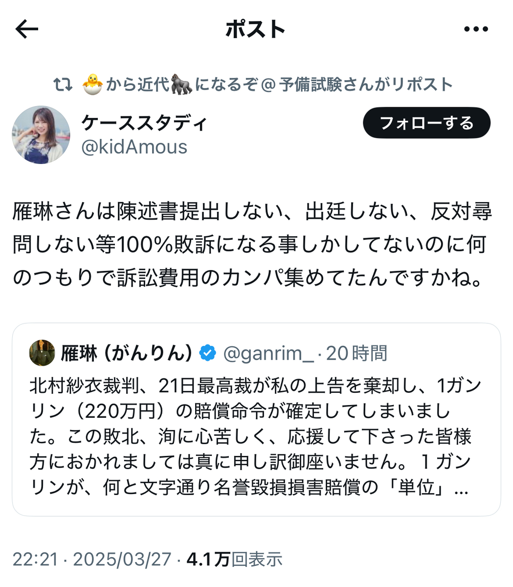 ●雁琳氏の上告棄却、法廷闘争三連敗で確定へ……!?