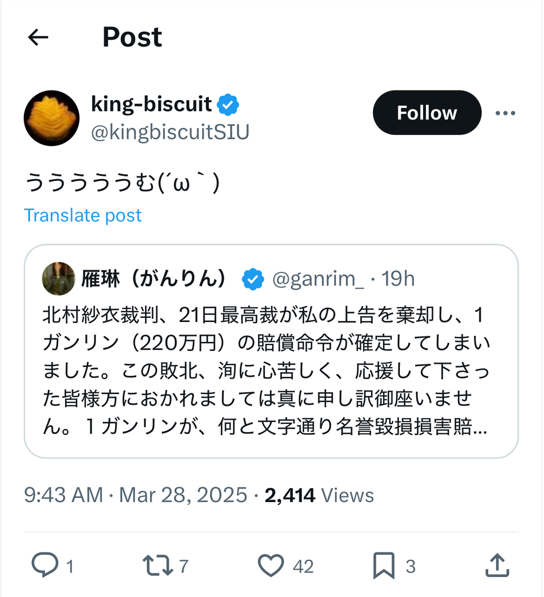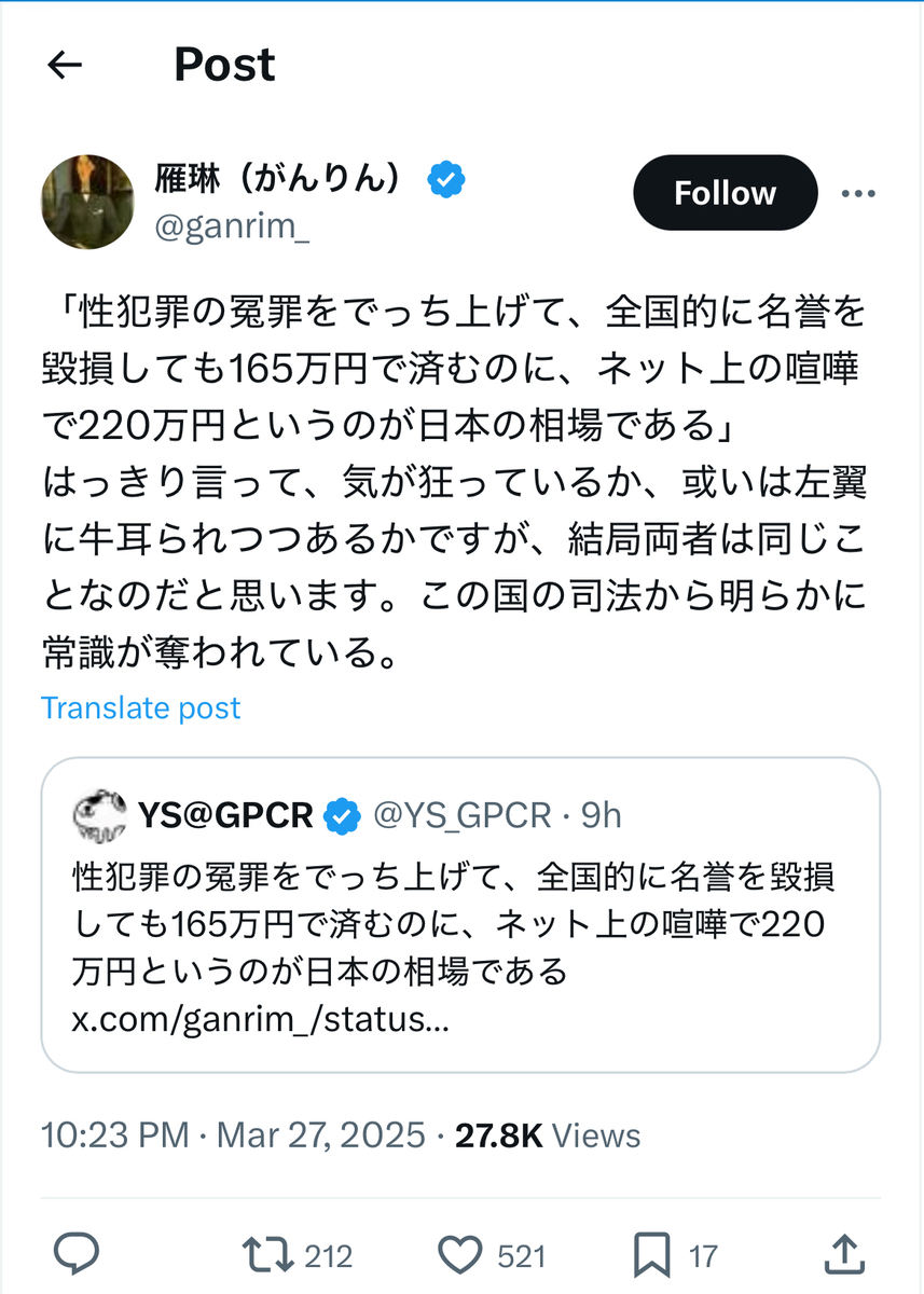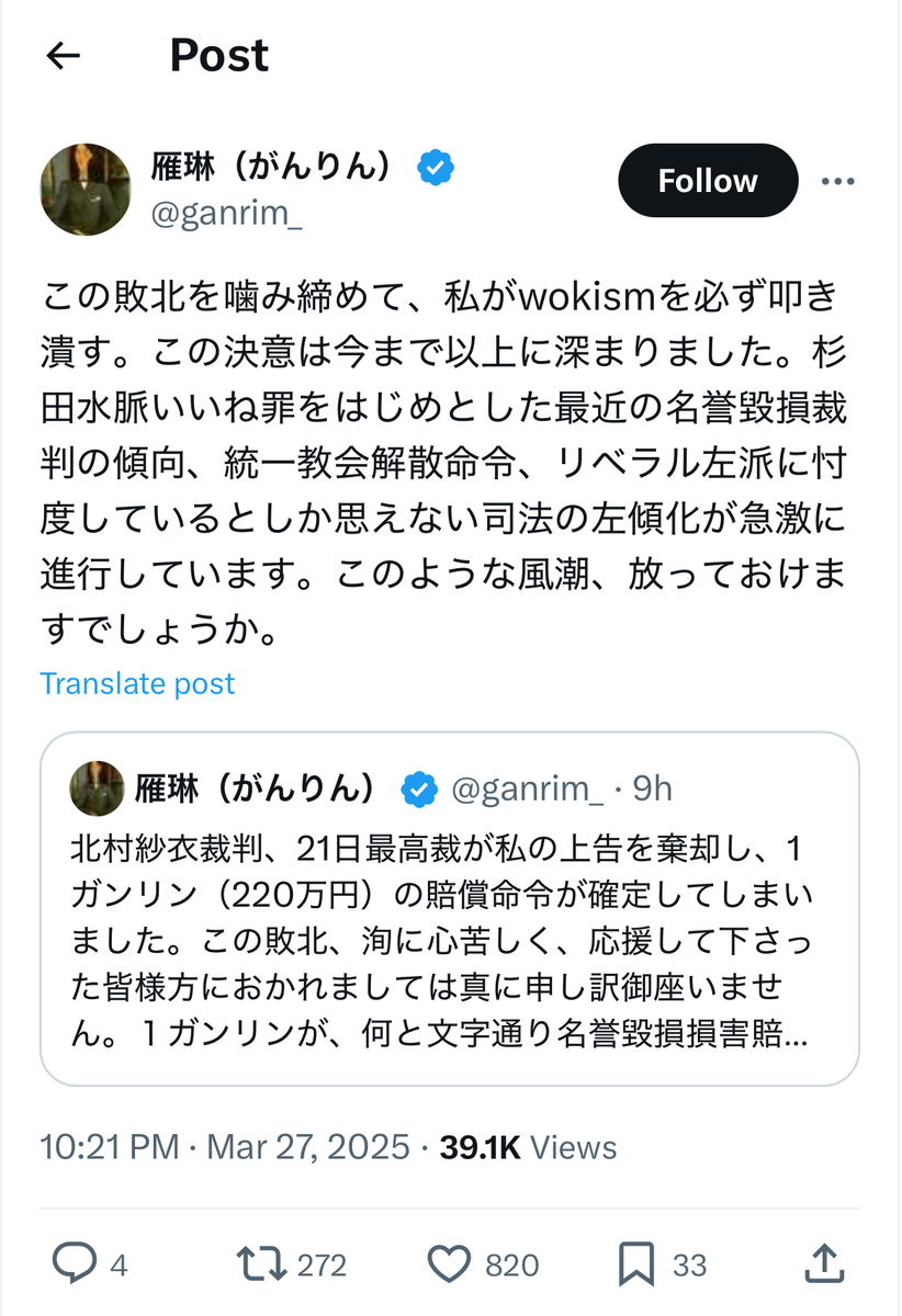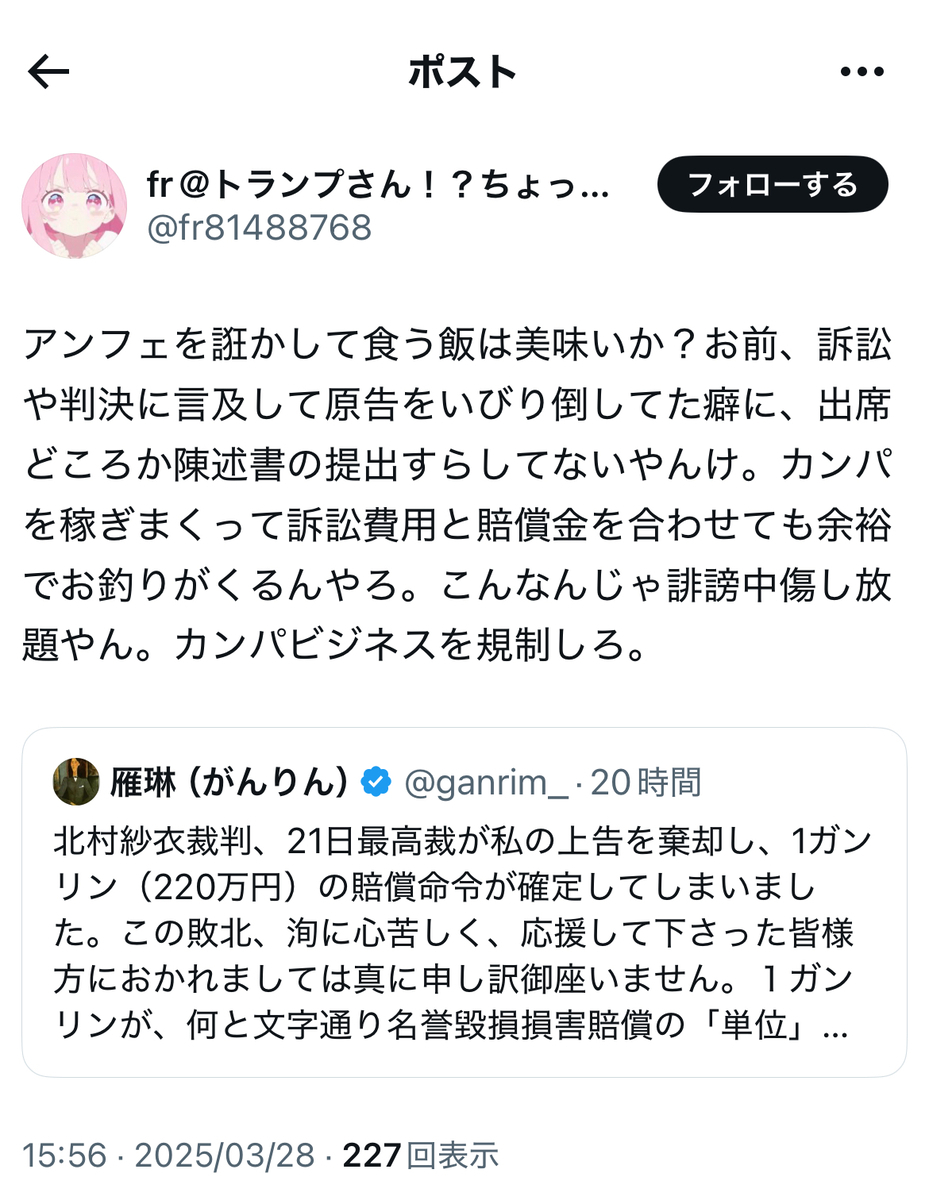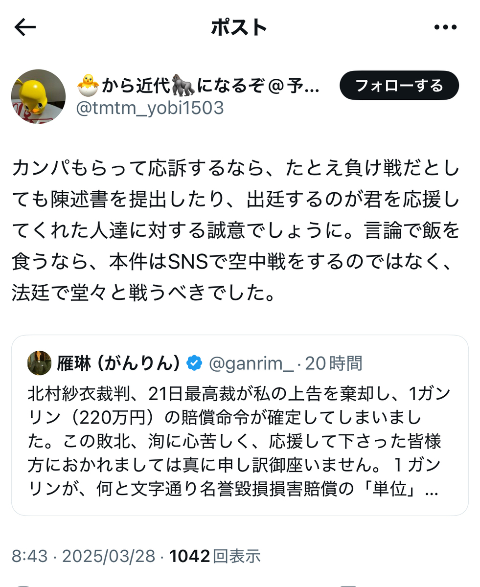 これによって、北村紗衣氏が雁琳氏を名誉毀損等で訴えた裁判は、雁琳氏サイドの全面敗訴が確定し、地裁、高裁に続いて三連敗に終わったことになります。