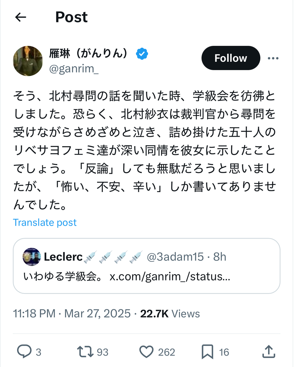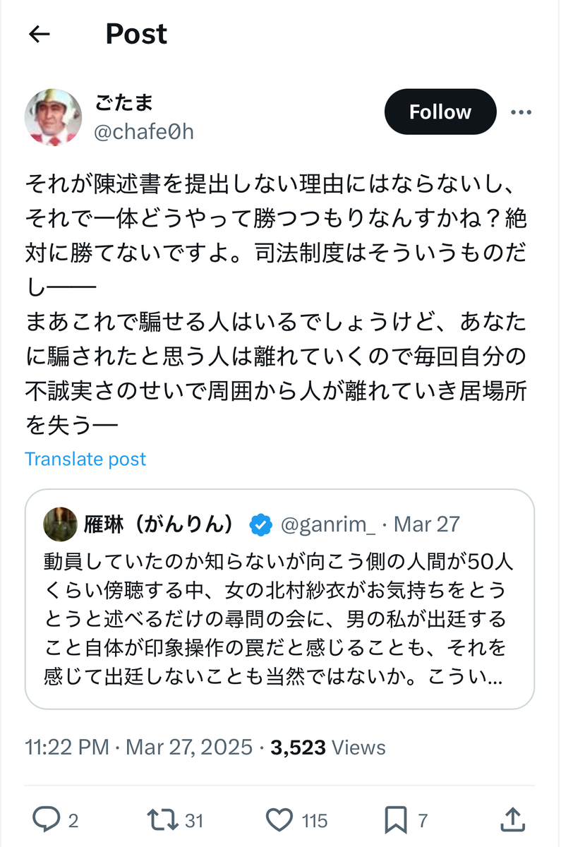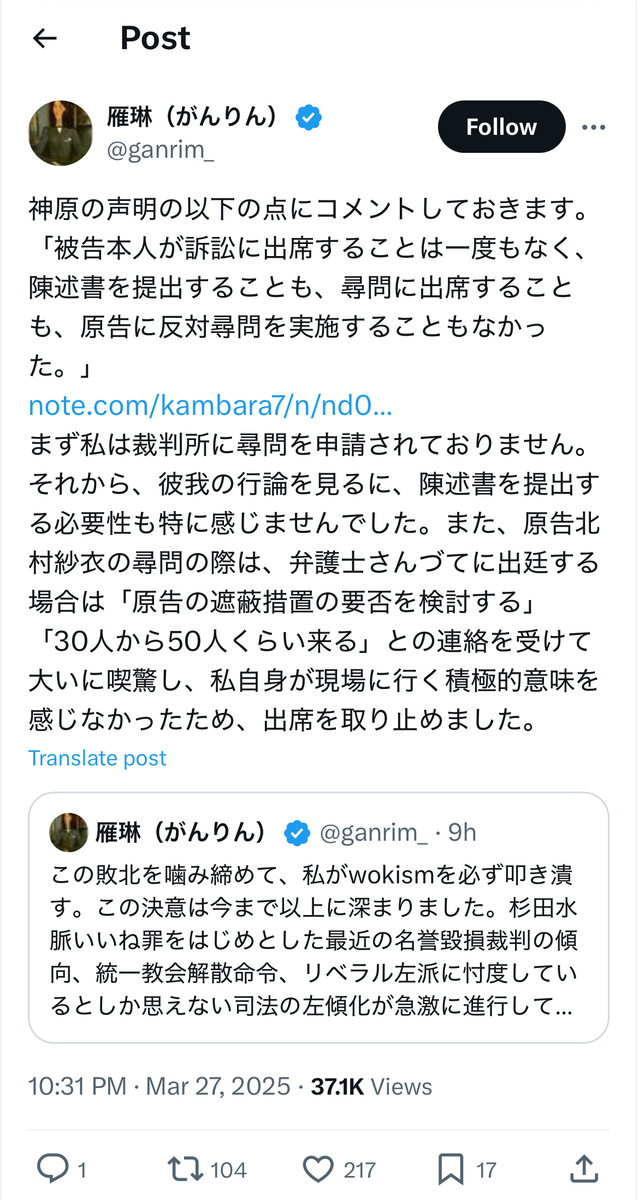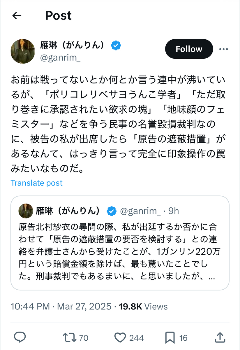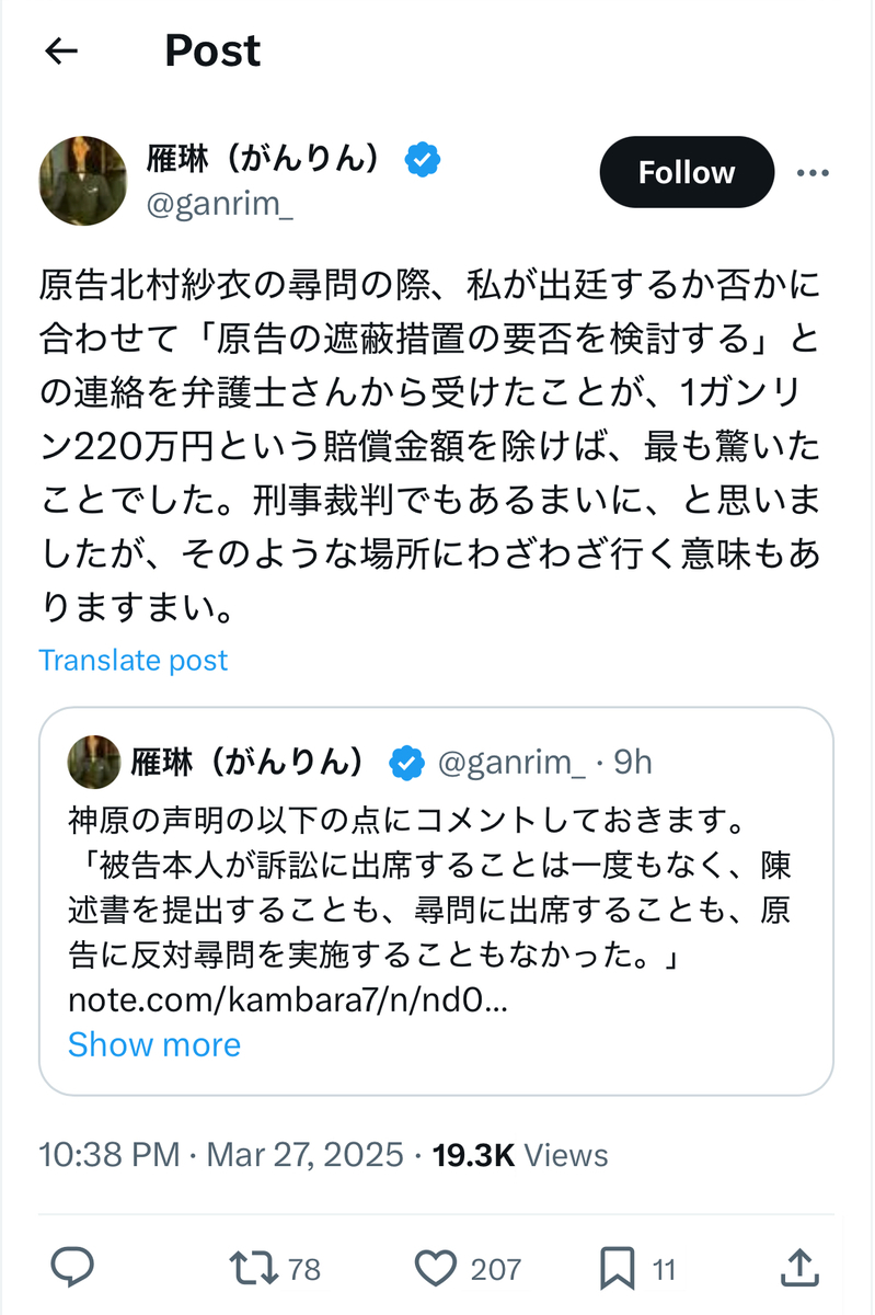 雁琳裁判の原告側(北村紗衣氏サイド)の代理人弁護士であった神原弁護士のnoteによると、被告側の雁琳氏ご本人は……何と法廷に一度も姿を見せず、原告側への反対尋問もせず、陳述書さえも提出しなかったとのことです。