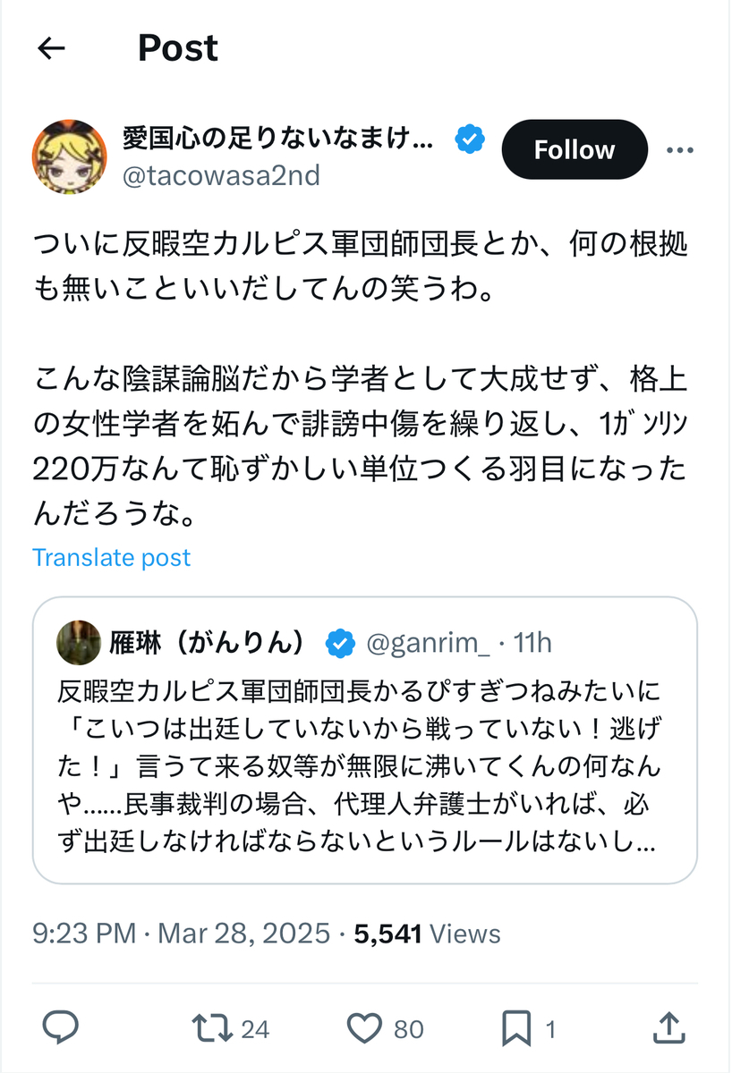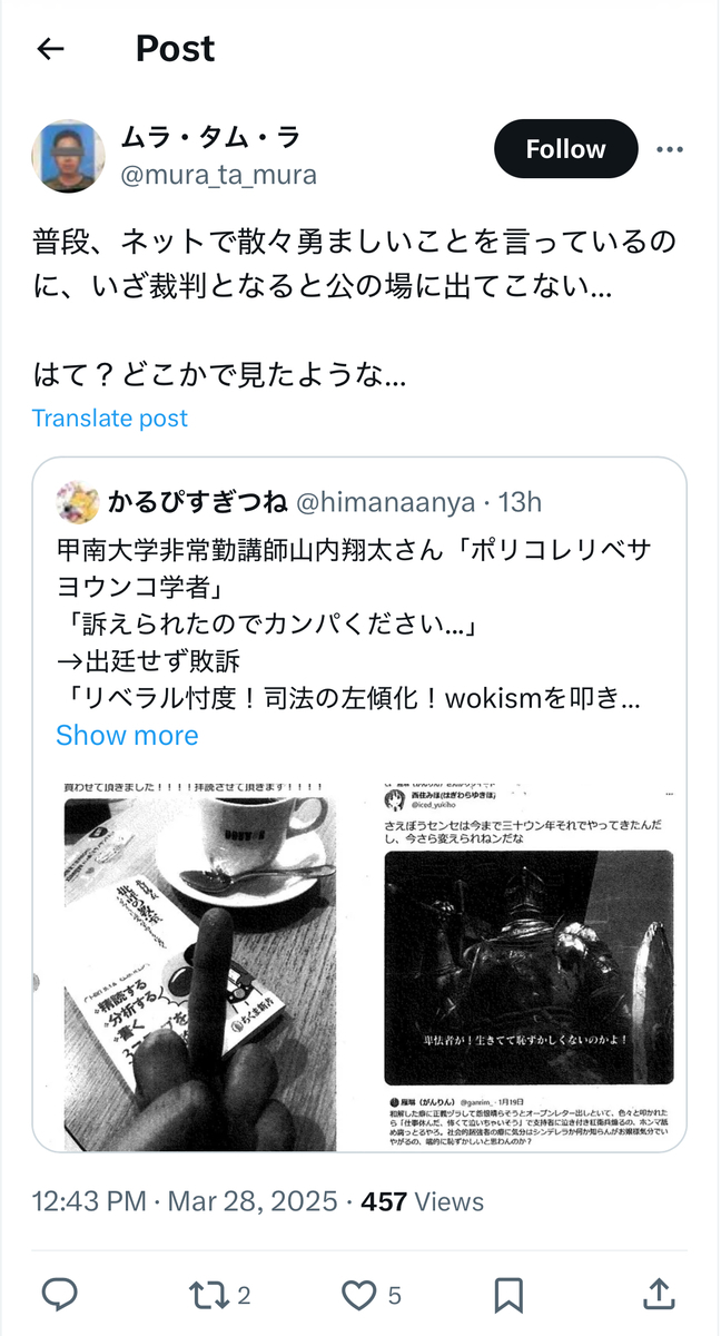 既に呉座勇一氏の裁判闘争も「実質4連敗」にて事実上幕を閉じており、雁琳氏の3連敗も合わせると、オープンレター関連裁判は……亀田センセイを始めとする反オープンレターズ「呉座神聖十字軍」の「実質7連敗」にて終幕したとも言っても過言ではないかと存じます。