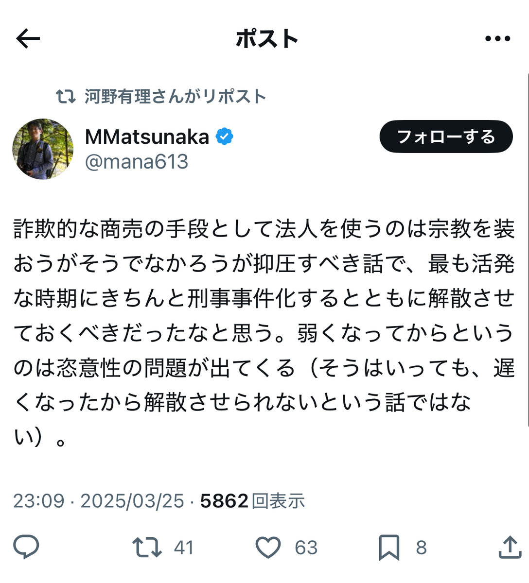 多くの識者が指摘しているように、表向きであれ、教団側が早期に過ちを認めて被害者に謝罪し、補償にも前向きな姿勢を取っていれば……恐らく、「解散請求」はされなかった可能性が高いかとも思われます。
