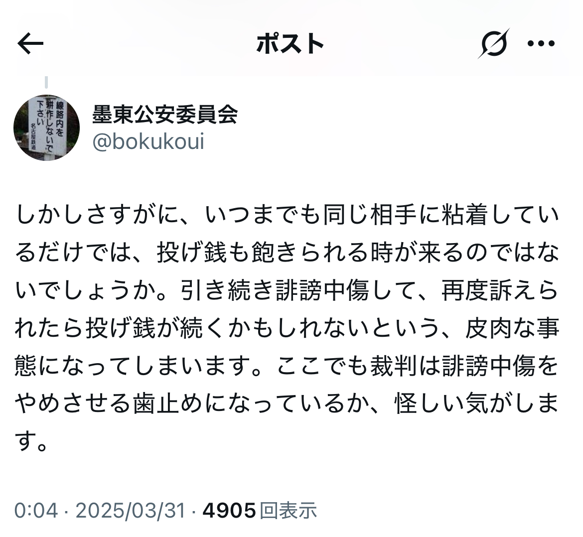 管見の限りでは……呉座勇一氏の「実質4連敗」、雁琳氏の「3連敗」という「実質7連敗」で幕を閉じた反オープンレターズの法廷闘争の顛末をも、連想させてくれるワンシーンかとも考えられます。