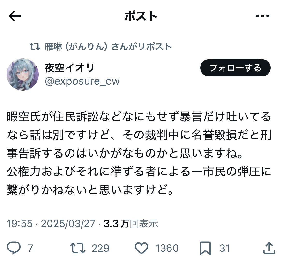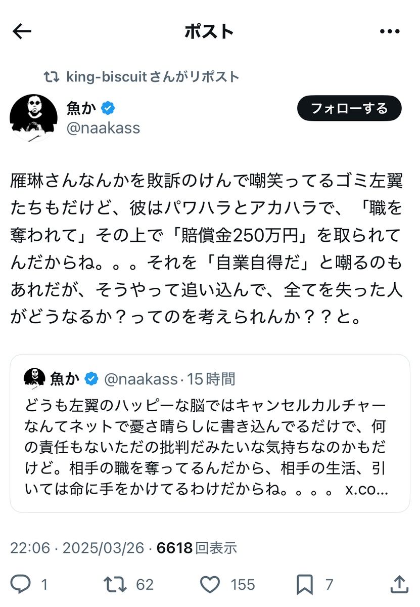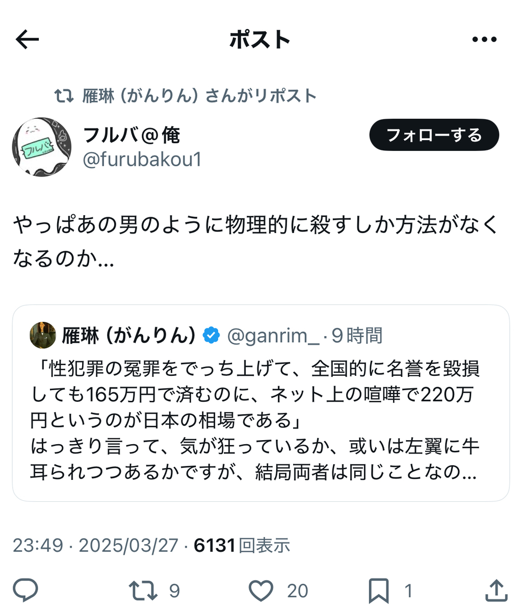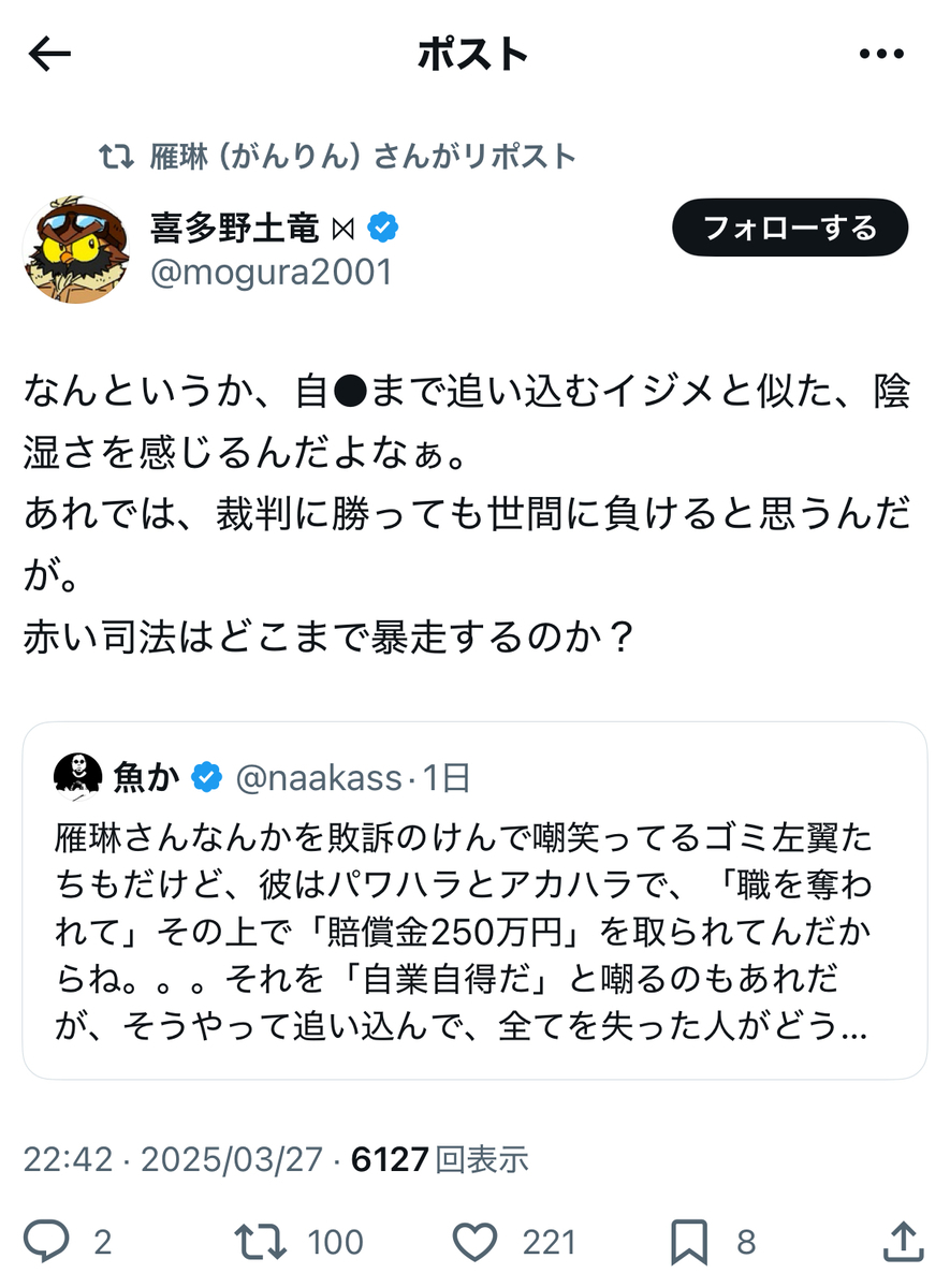 オープンレターの何処が集団吊し上げなのか。そもそも、雁琳氏が一審で全面敗訴した直後、突如、呉座勇一氏に向かって背後から純度100%の「善意」で撃つような真似を……ゲフンゲフン、失礼致しました。