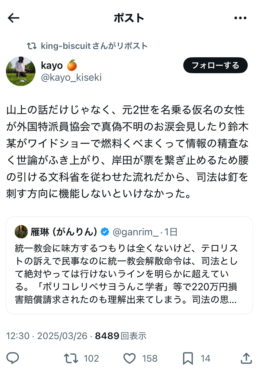 言うまでもなく、統一協会の解散命令云々は、宗教法人法に基づいた「法人格」が焦点であり、そもそも、「何」に対する解散命令の問題なのか。
