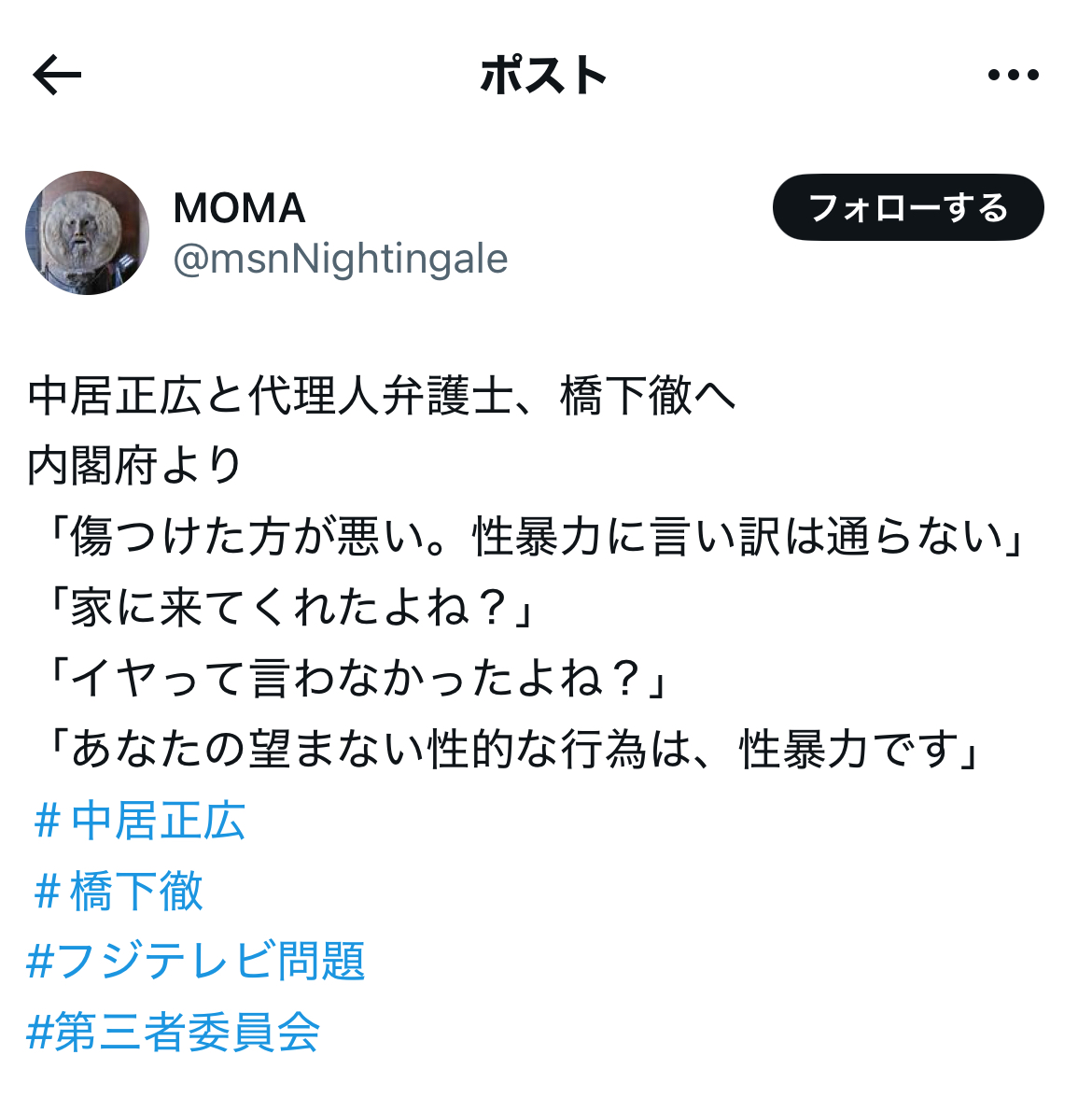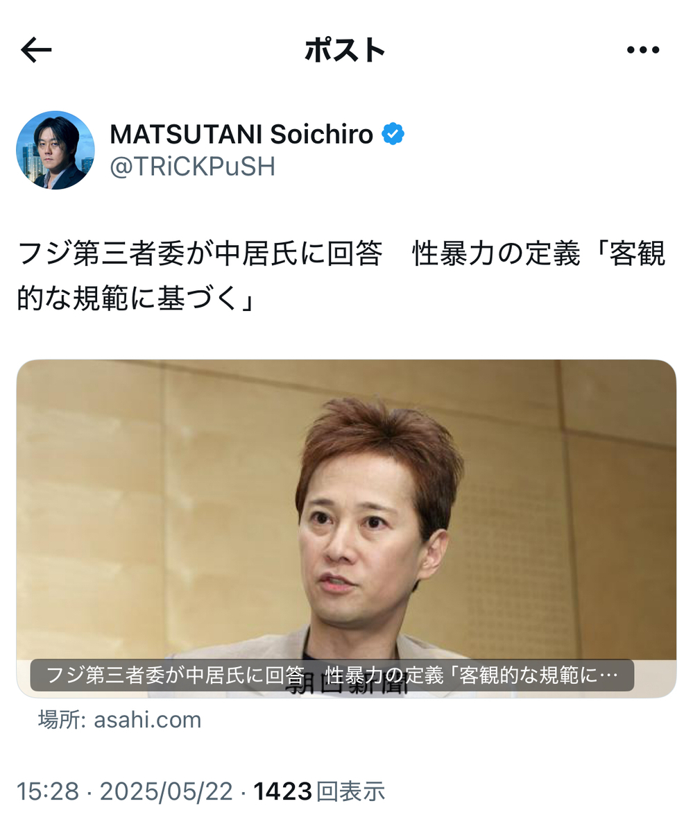 ・中居正広と、フジテレビと親会社が設置した第三者委員会との攻防が泥仕合の様相を呈して来た模様です。