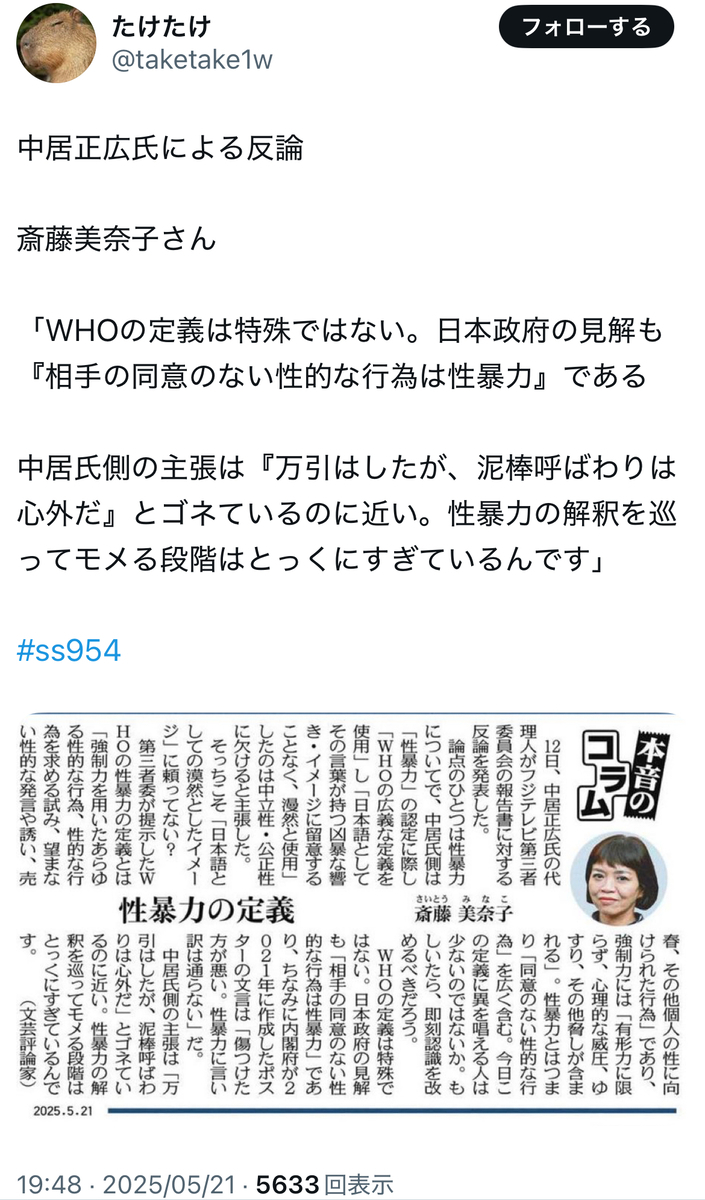 5月12日、中居の代理人弁護士らが「性暴力」を認定するにあたって、根拠とした証拠の開示などを第三者委に要求するも、当の第三者委は「独立性・中立性を損なう結果となる」などの理由から開示を差し控えると事実上拒否しておりました。