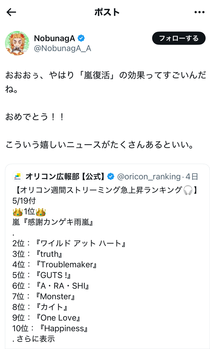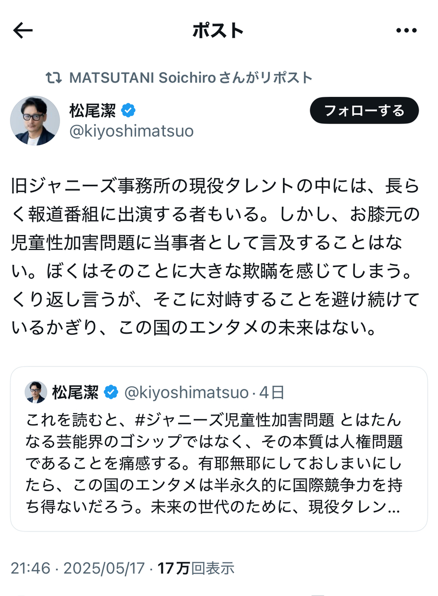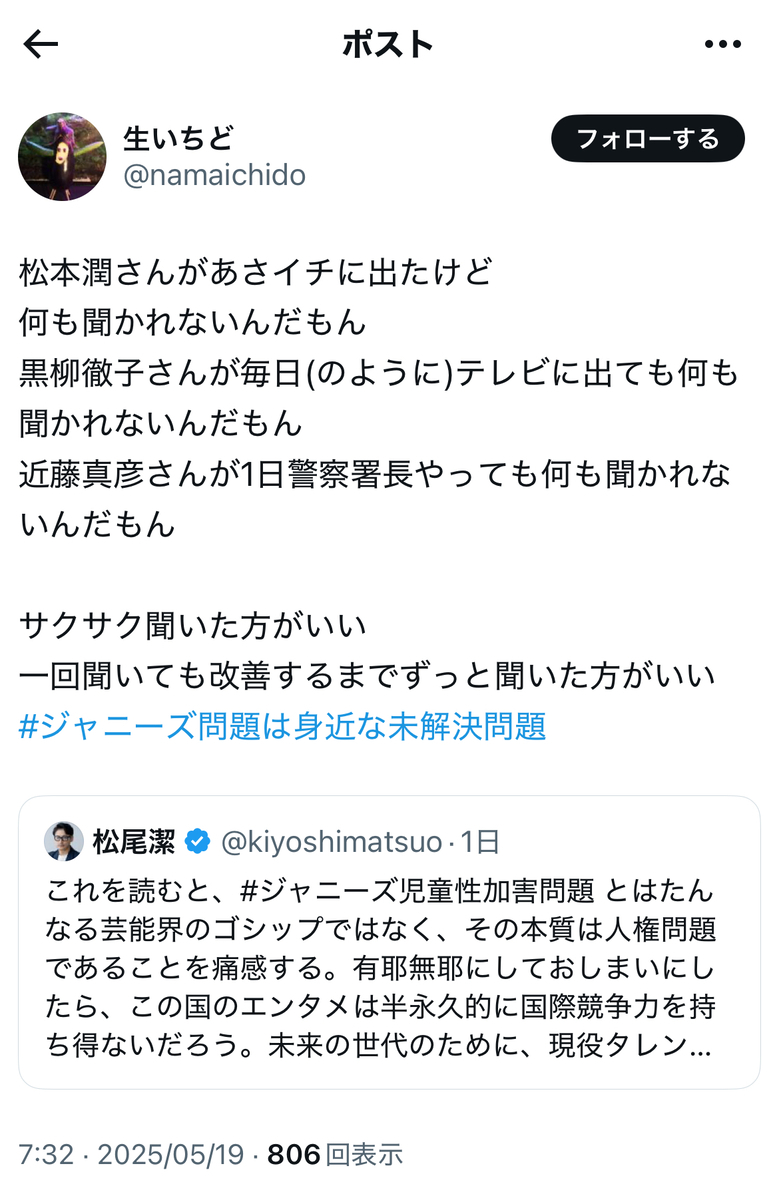 例によって例の如く、炎上柱🔥は……というか、最近は嵐教の信者たちと松潤ファンからの「いいね」ラッシュでハイになる余り、ジャニー喜多川の性加害事件の被害者の方々への「被害者非難」にも、やっと飽きて来たような気配もあります。