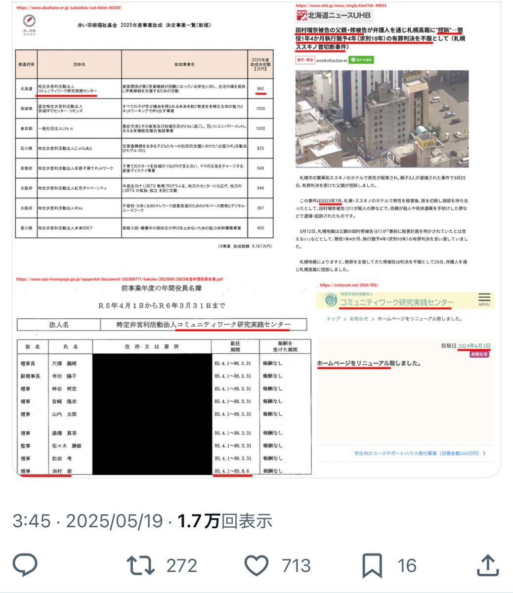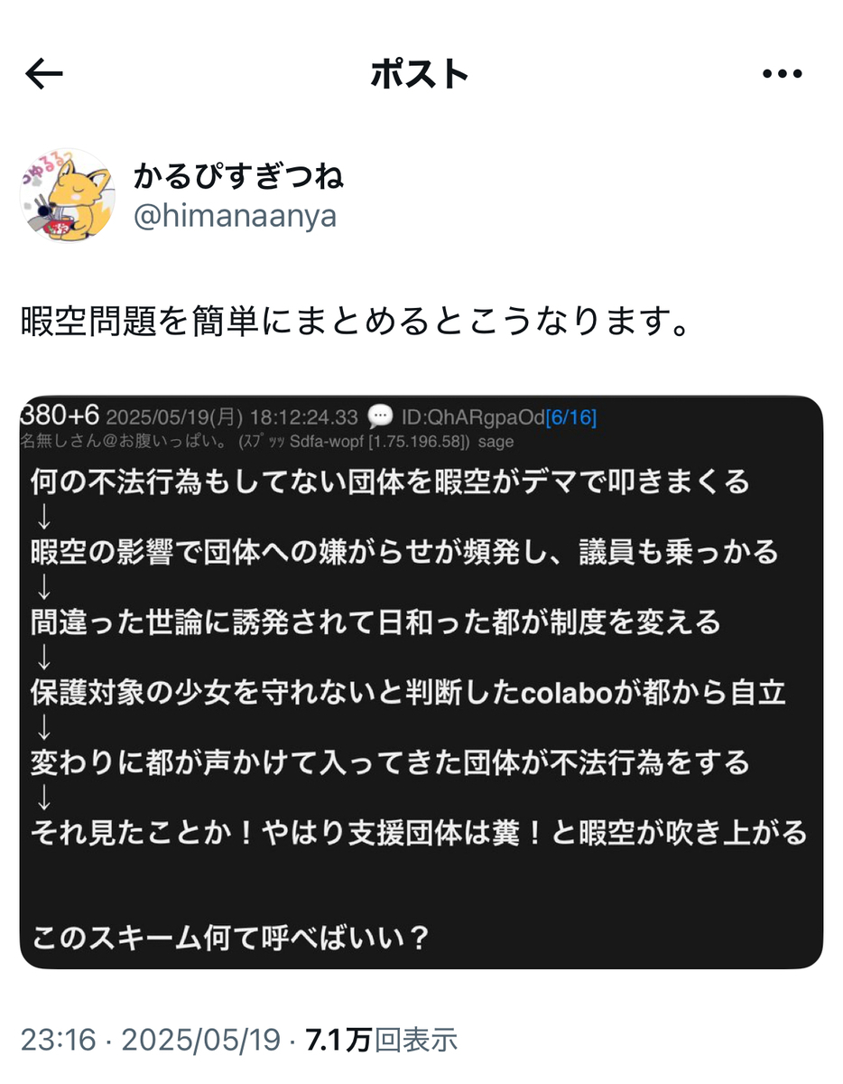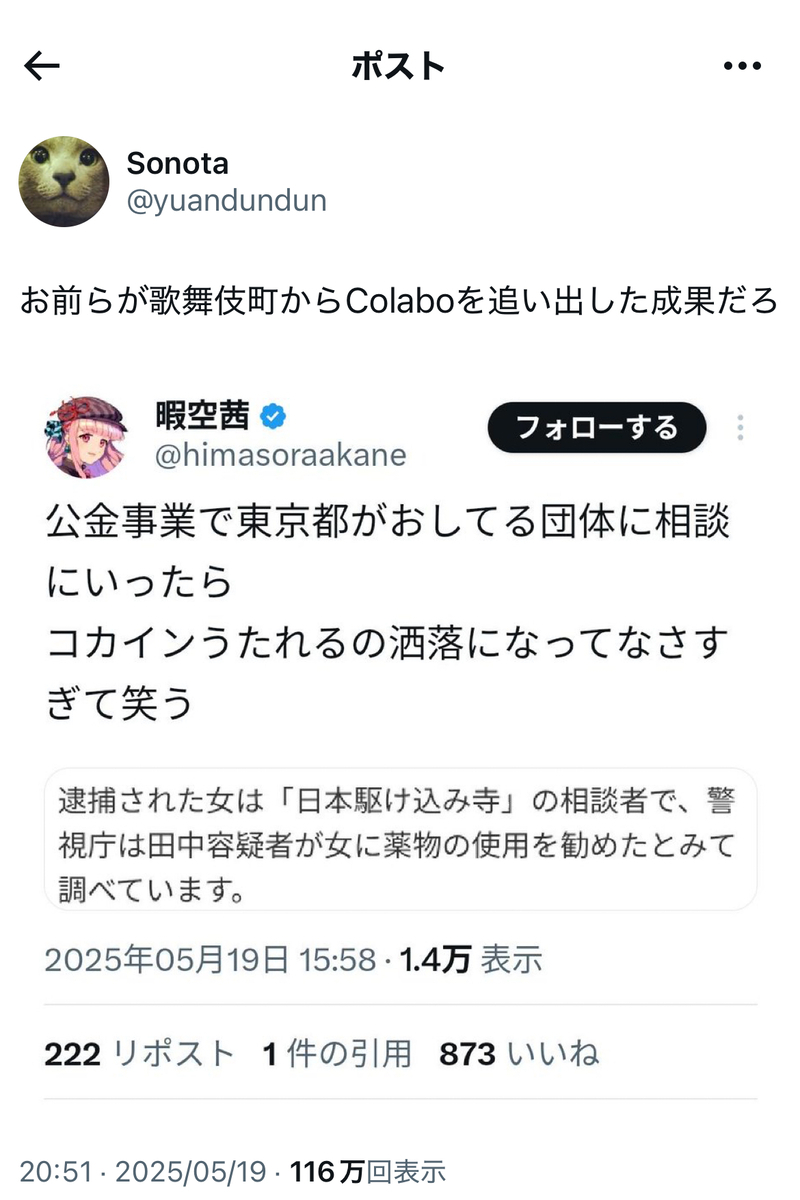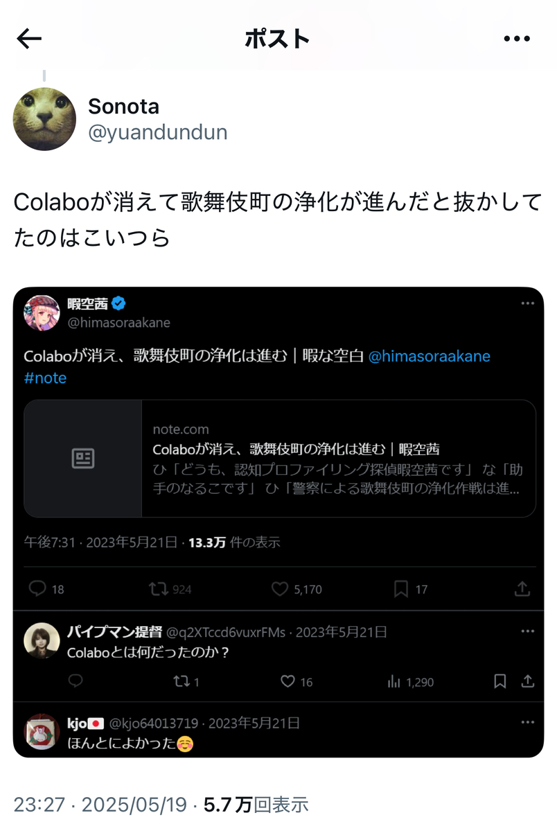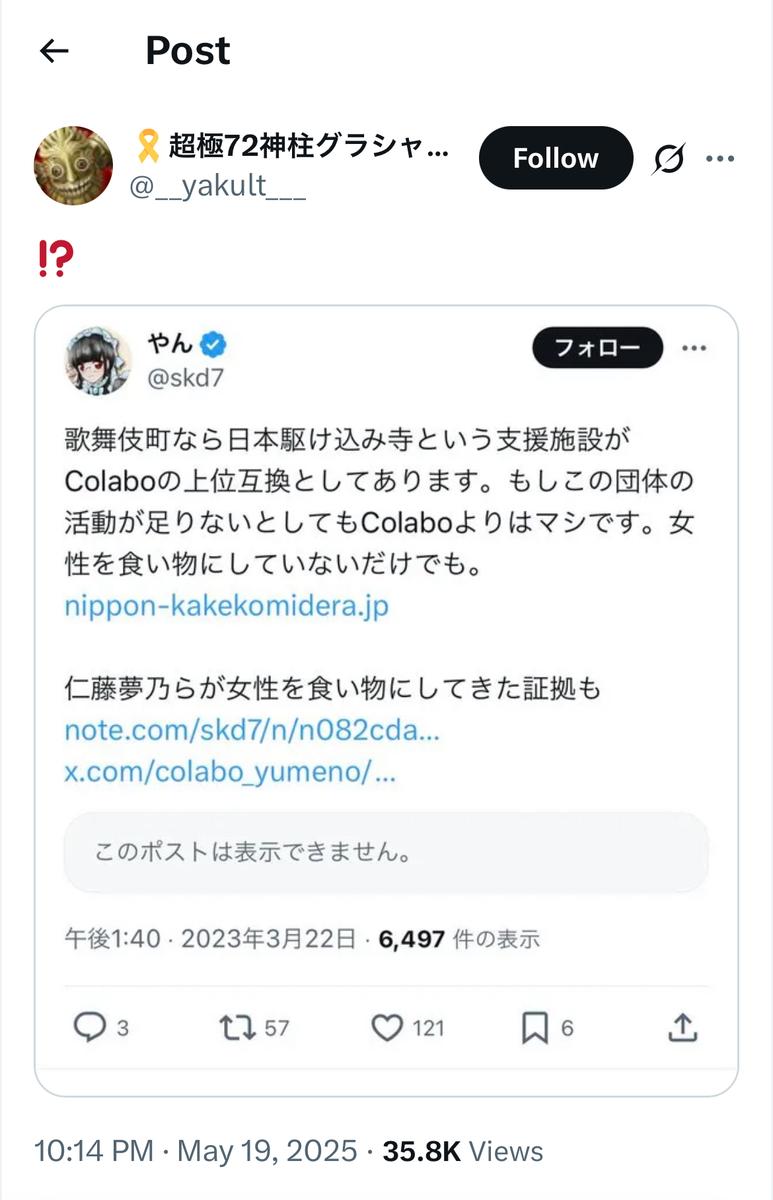 余談ながら、尊師が本邦を代表する民俗学者・大月隆寛(king-biscuit)氏ら新宿区長をもお得意の「認知プロファイリング」(陰謀論的思考法)に引っ掛けるような形で、女性支援団体Colaboを歌舞伎町から放逐するに至った顛末は……きみまも事件といい、着々と「成果」を出している模様です。