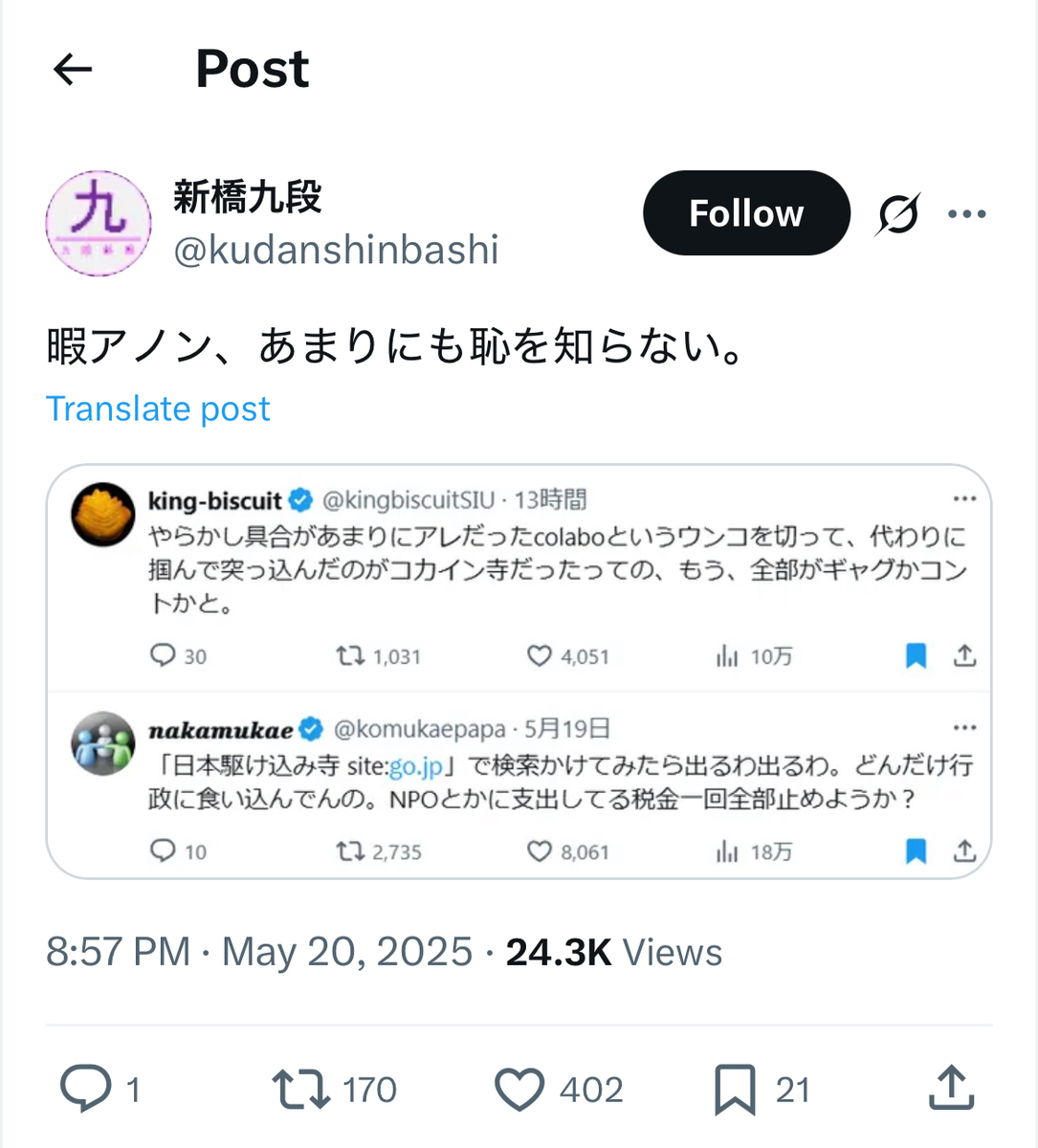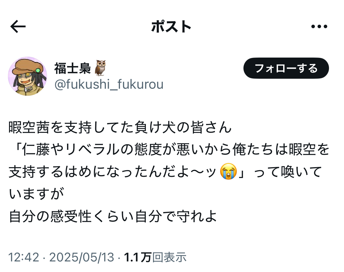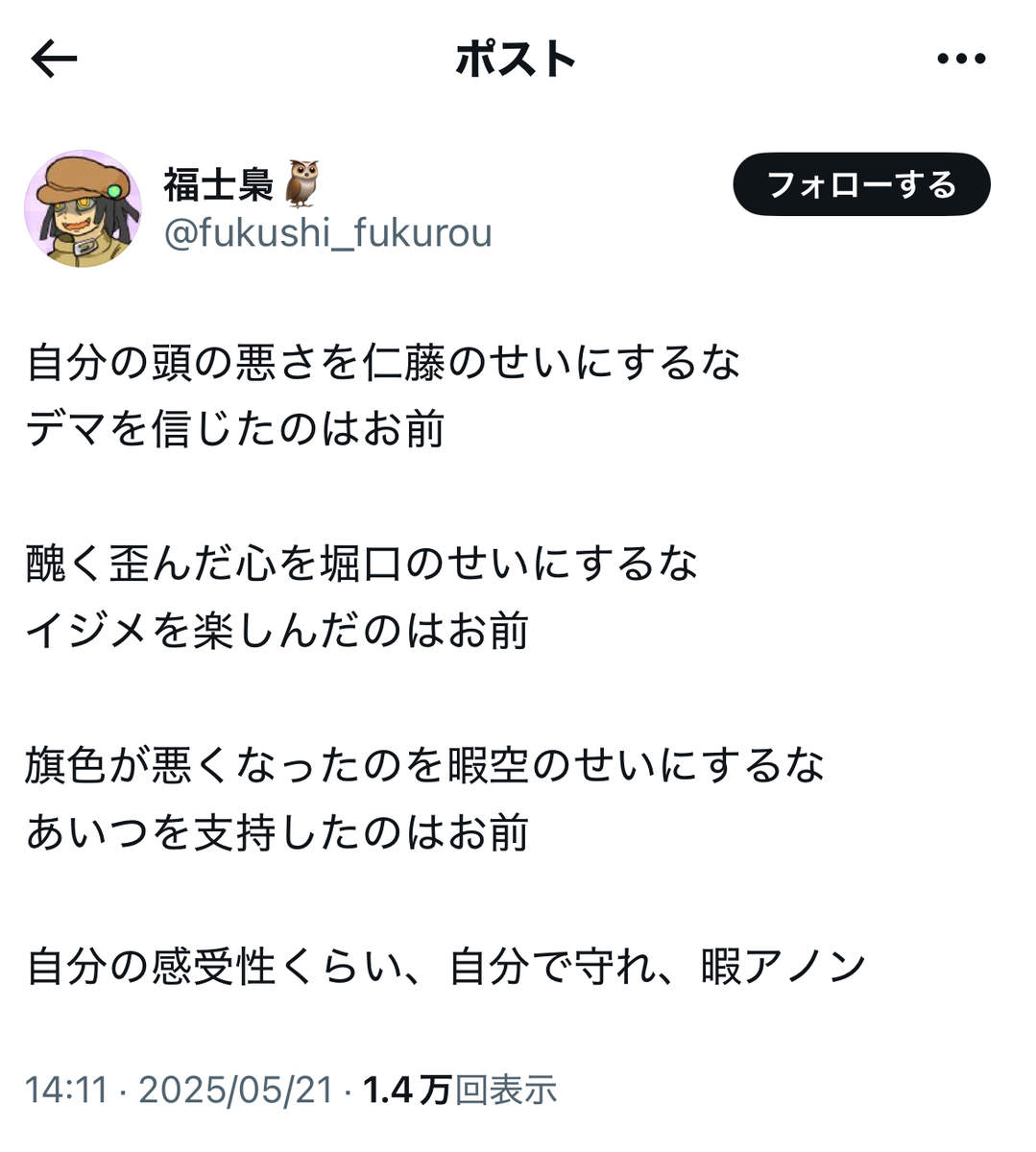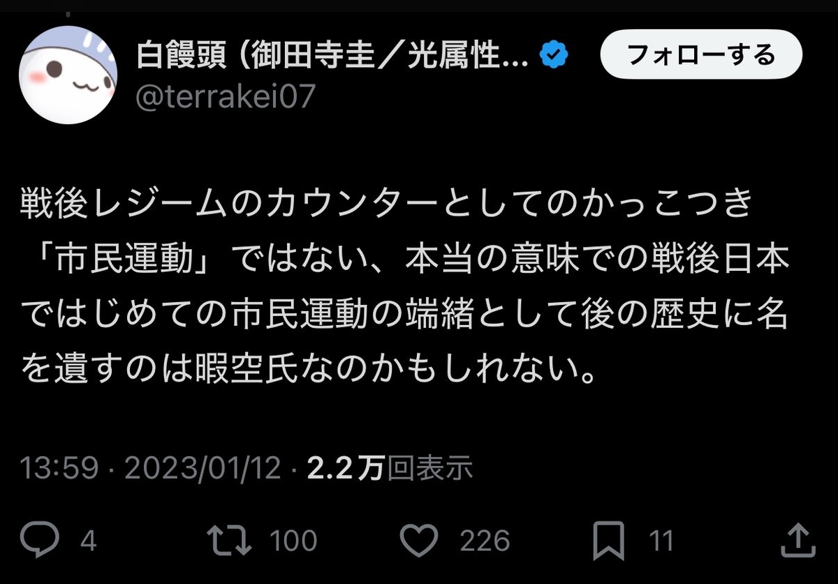 余談ながら、尊師が本邦を代表する民俗学者・大月隆寛(king-biscuit)氏ら新宿区長をもお得意の「認知プロファイリング」(陰謀論的思考法)に引っ掛けるような形で、女性支援団体Colaboを歌舞伎町から放逐するに至った顛末は……きみまも事件といい、着々と「成果」を出している模様です。