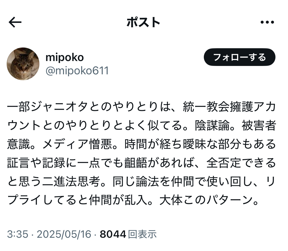 「一部ジャニオタとのやりとりは、統一教会擁護アカウントとのやりとりとよく似てる。陰謀論。被害者意識。メディア憎悪。時間が経ち曖昧な部分もある証言や記録に一点でも齟齬があれば、全否定できると思う二進法思考。同じ論法を仲間で使い回し、リプライしてると仲間が乱入。大体このパターン。」
