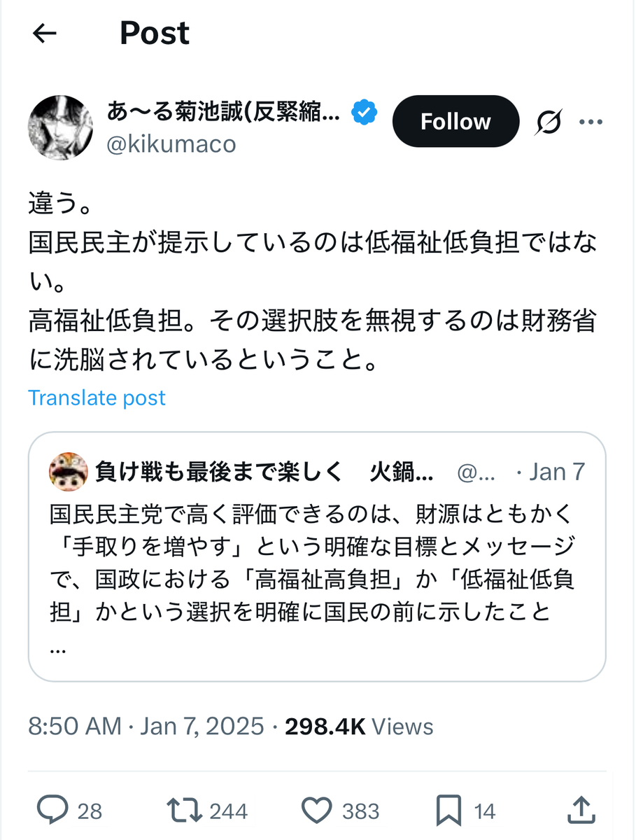 高福祉低負担。その選択肢を無視するのは財務省に洗脳されているということ。」