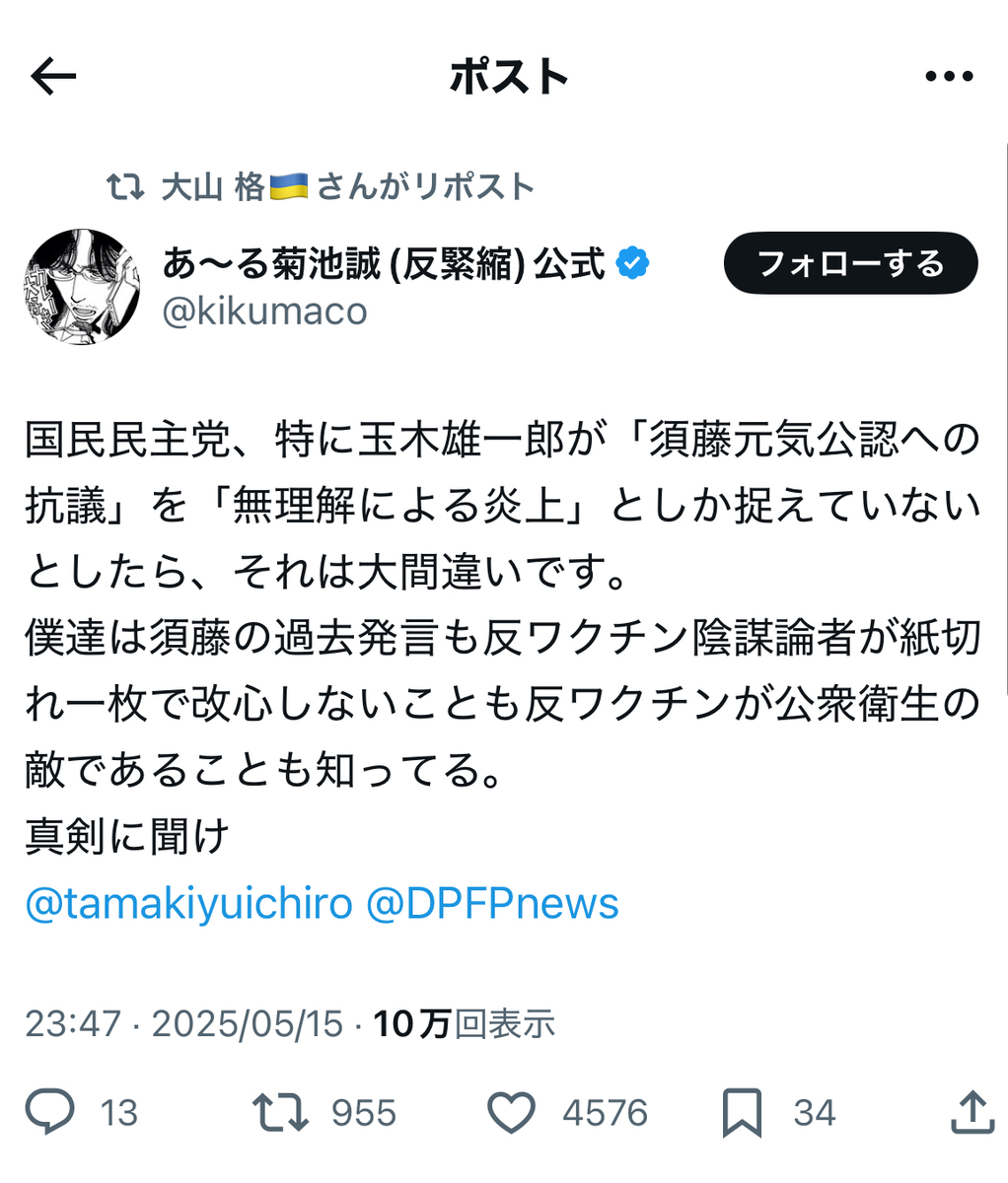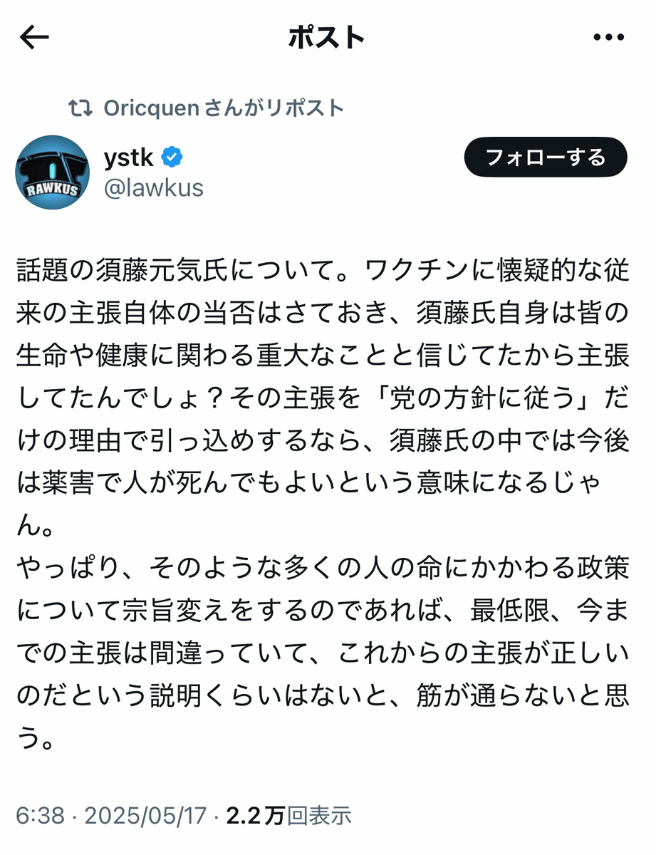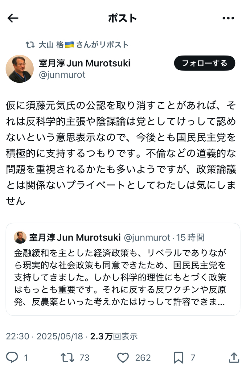 が、MMT論客としても相思相愛だった筈の国民民主党が、次期参院選に向けての比例代表の候補に、反ワクチン論者の須藤元気氏をリストアップしたことを発表するや否や……不遜な言い方で恐縮ながら、伊藤剛・大山格両氏らのTLと合わせて、さながらスーパー・ノヴァの爆発じみた化学反応が生じてしまったかと考えられます。
