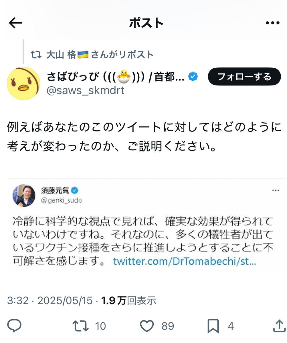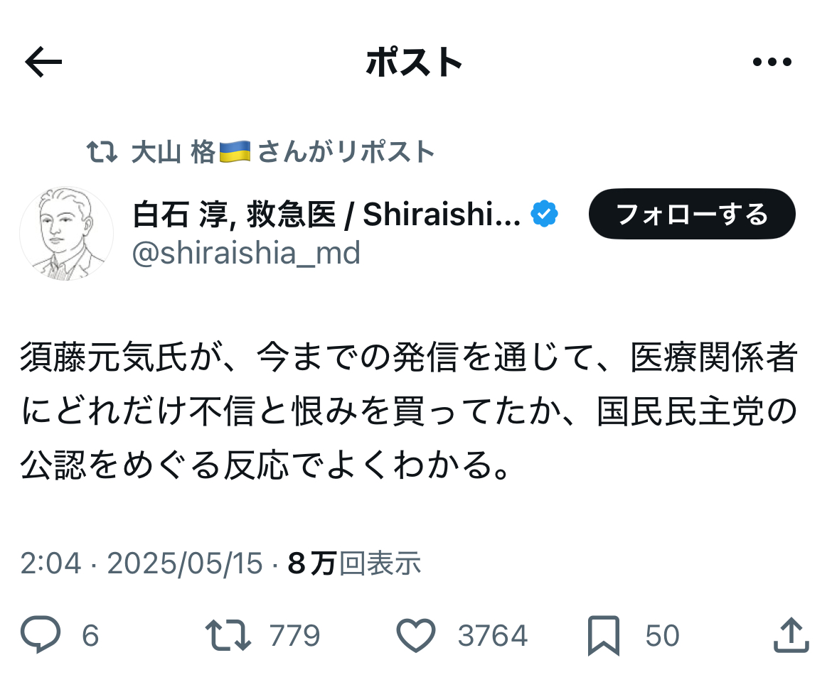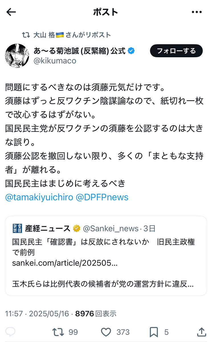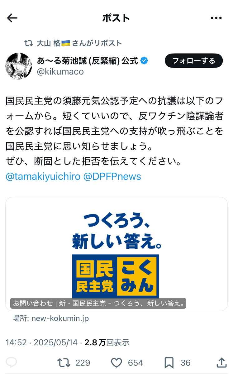 が、MMT論客としても相思相愛だった筈の国民民主党が、次期参院選に向けての比例代表の候補に、反ワクチン論者の須藤元気氏をリストアップしたことを発表するや否や……不遜な言い方で恐縮ながら、伊藤剛・大山格両氏らのTLと合わせて、さながらスーパー・ノヴァの爆発じみた化学反応が生じてしまったかと考えられます。