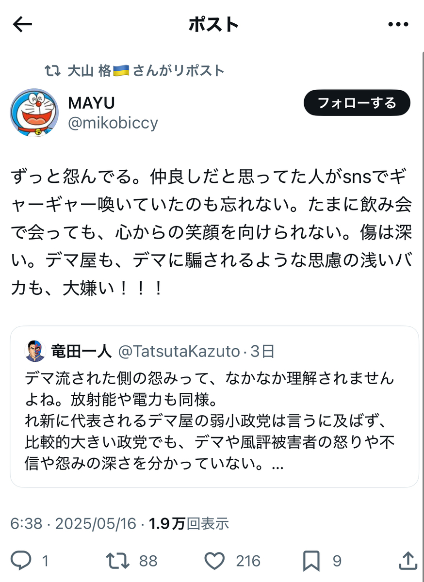 というか、一人でも自身の支持政党等にトンデモな人がいることが絶対に許せないという潔癖な支持者は……近年はどちらかというと、左派・リベラルというか、反・反リベラルに多いような傾向があるかとも考えられるのです。