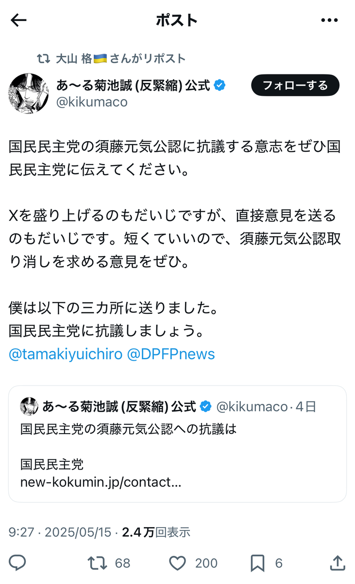 が、それはさておき、「令和の背後の一突き伝説」に端を発した反オープンレター騒動でも、これまで散々「オープンレターはキャンセルカルチャーだ!?」などと言わんばかりに、大騒ぎしてきた菊池氏ご本人が、須藤氏の公認撤回等を声高に要求し、あまつさえ国民民主党へ繰り返し抗議等を続けるなど……これこそ、ド直球のキャンセルカルチャーか、或いはそれ以上の行為の可能性もあるかと推定されます。
