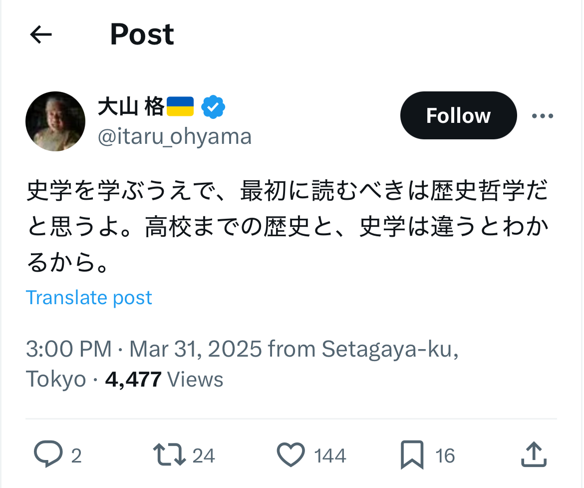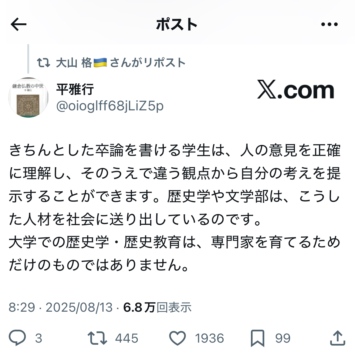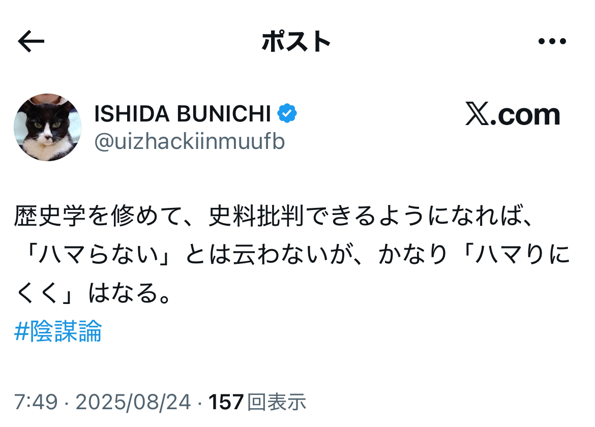 未だに「令和の背後の一突き伝説」の陰謀論・デマゴギーに嵌って、ワーワー大騒ぎしているらしい可能性もあることなどを鑑みると、歴史学。それも日本史学を修めて、史料批判が出来るスキル等をマスターしても……遺憾ながら、それらがご本人のリテラシー能力の向上に繋がるかは、やはり、全くの別問題なのでしょう。