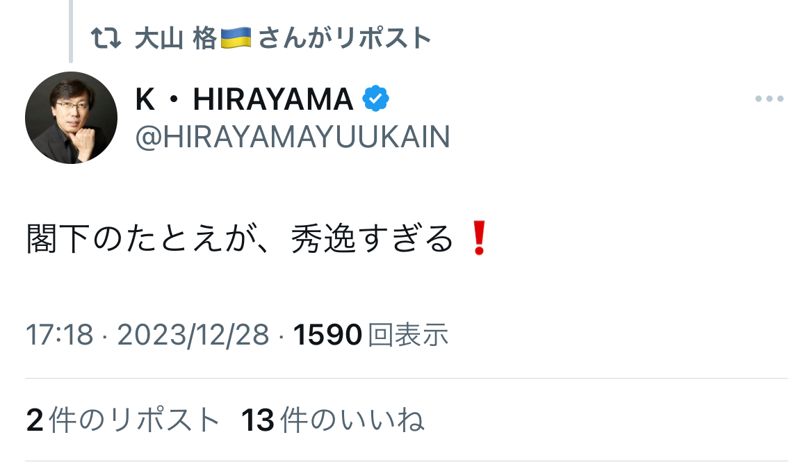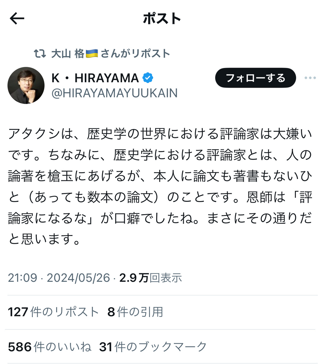 繰り返しますが、日本史学履修者としても、事あるごとに「歴史学とは何か」の蘊蓄を垂れているらしい大山氏ご本人ですが……やはり、平山優氏からも「閣下」の尊称で呼ばれるなどして、ご満悦の模様です。