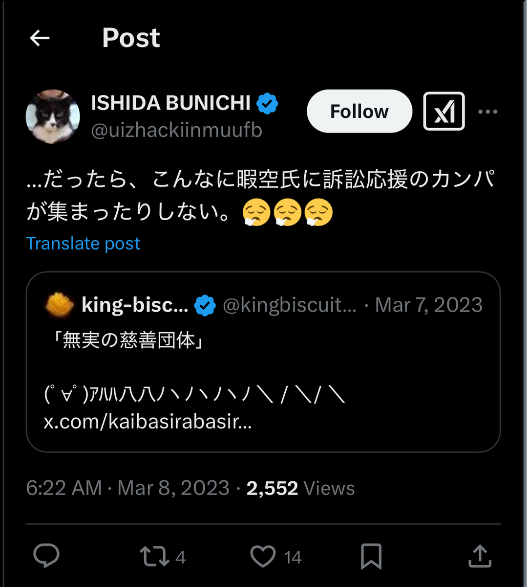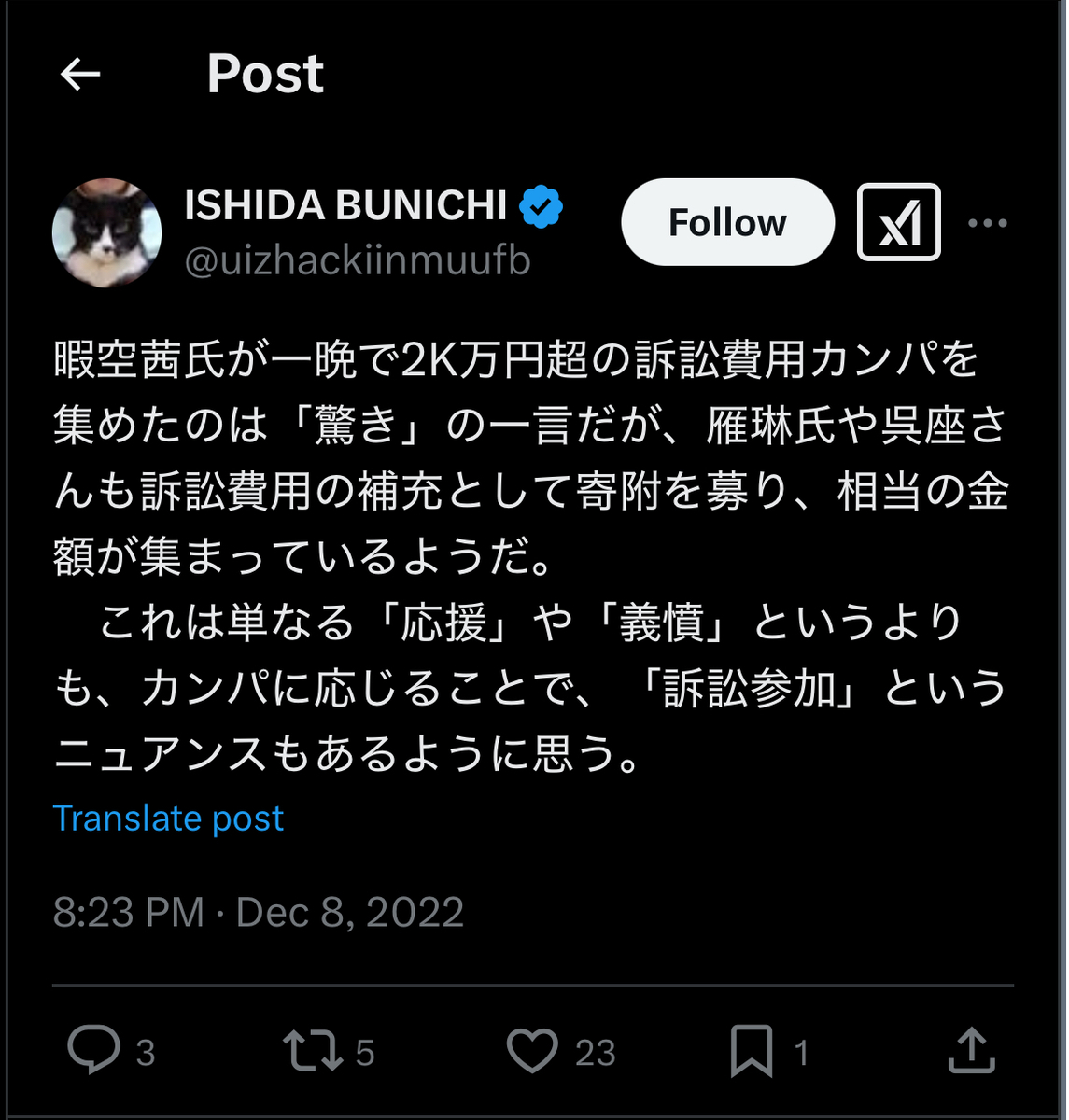 いずれにせよ、呉座氏が「主張」を取り下げて「敗北的和解」(実質敗訴)に踏み切ったのは……オープンレターと日文研から喰らった処分との間で、何らかの因果関係が成立するという旨のご自身の「主張」こそ、無理筋であった可能性を、事実上認めざるを得なかった結果でもあると考えますが。