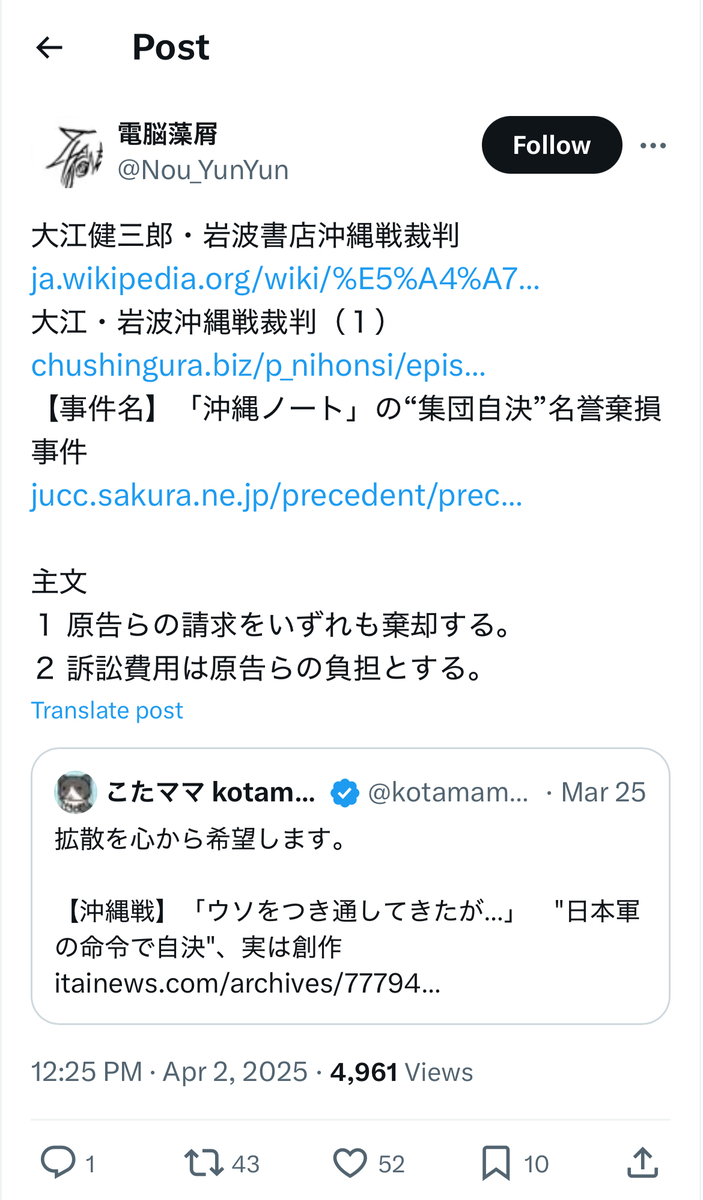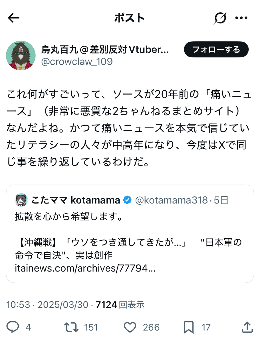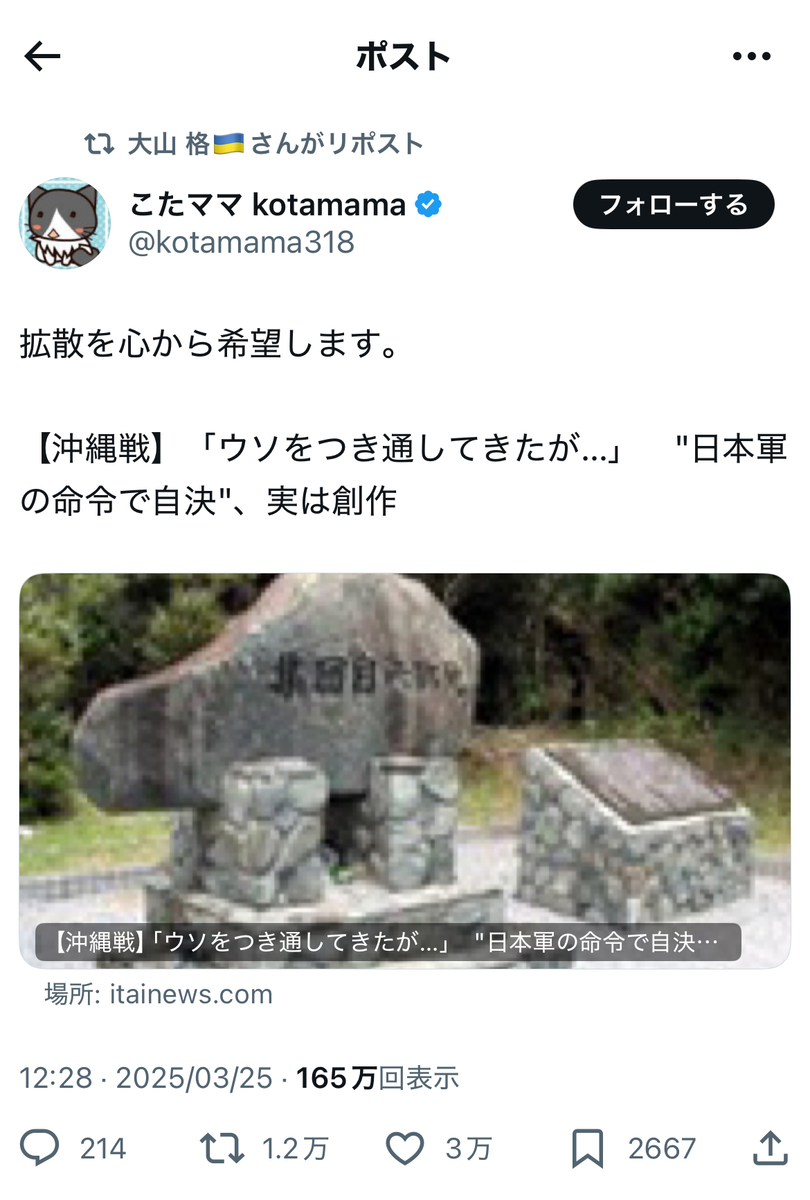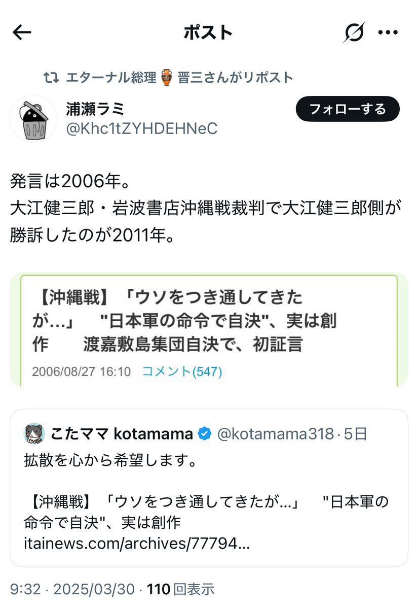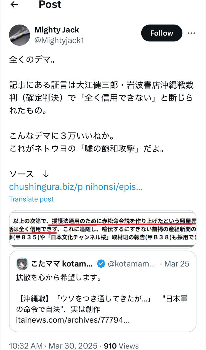 沖縄戦の集団自決を巡る根拠不明な……って、うわあ、何を(以下略。