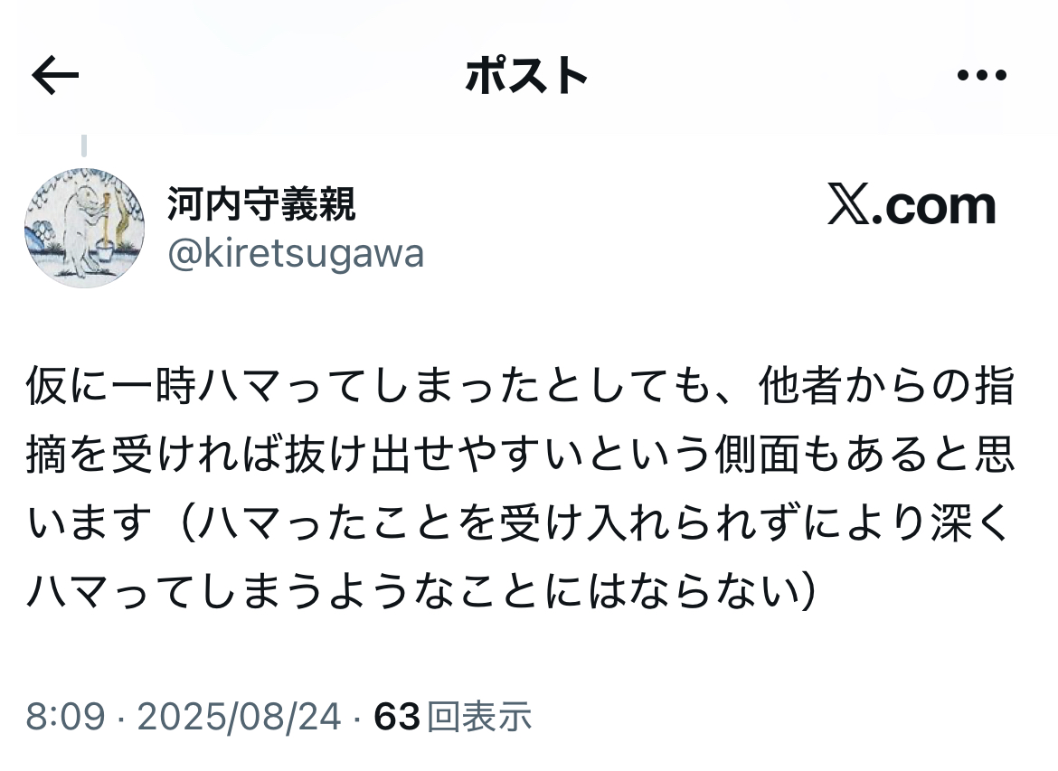 「仮に一時ハマってしまったとしても、他者からの指摘を受ければ抜け出せやすいという側面もあると思います(ハマったことを受け入れられずにより深くハマってしまうようなことにはならない)」