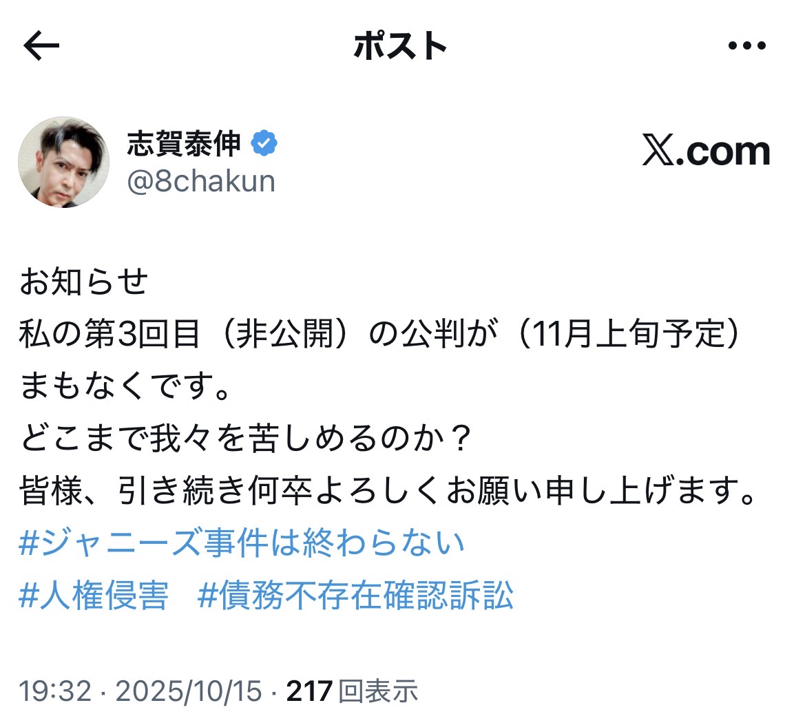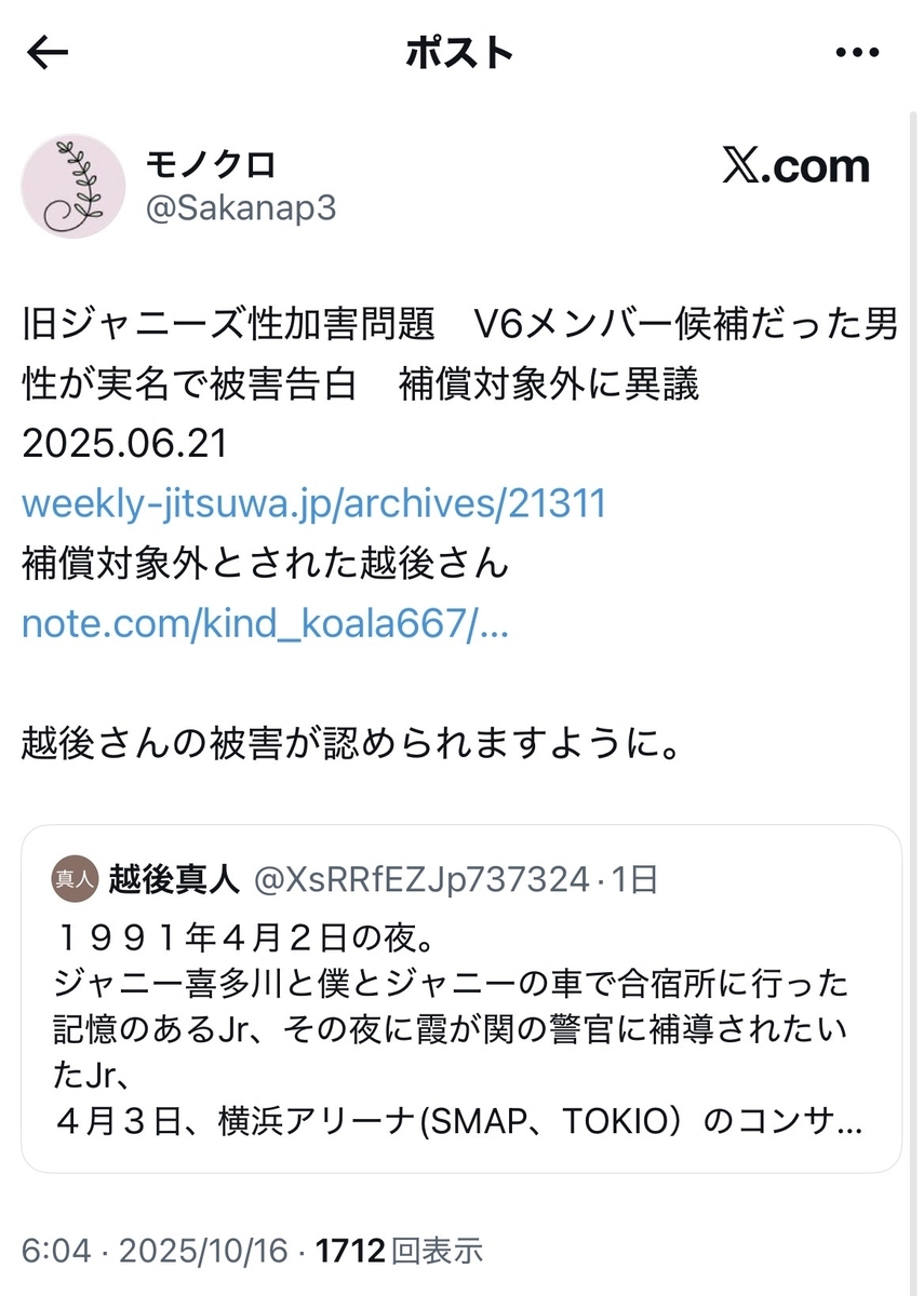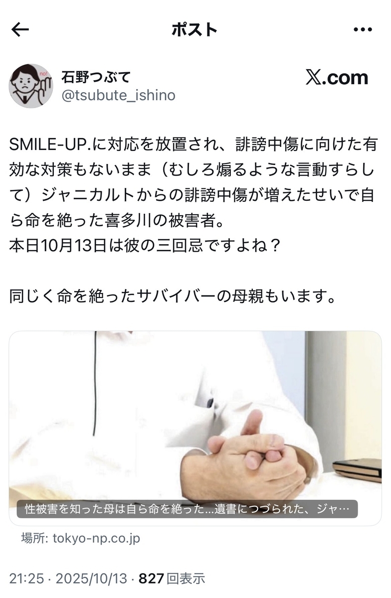 10月13日は、言うまでもなく、誹謗中傷に耐えかねて自死を遂げられた、ジャニー喜多川の性加害事件の被害者の方の命日であり、今年で三回忌になります。