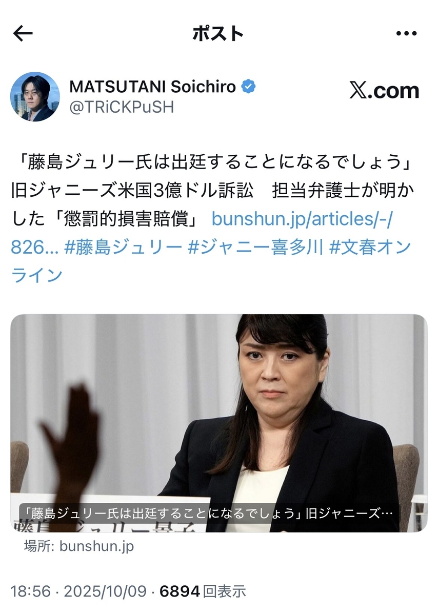 ・現在発売中の月刊誌『文藝春秋』(2025年11月号)にて、アメリカで旧ジャニーズ等を相手取った3億ドル訴訟を担当しているクリストファー・ブレナン弁護士のインタビュー記事「藤島ジュリーを逃さない」が掲載されております。