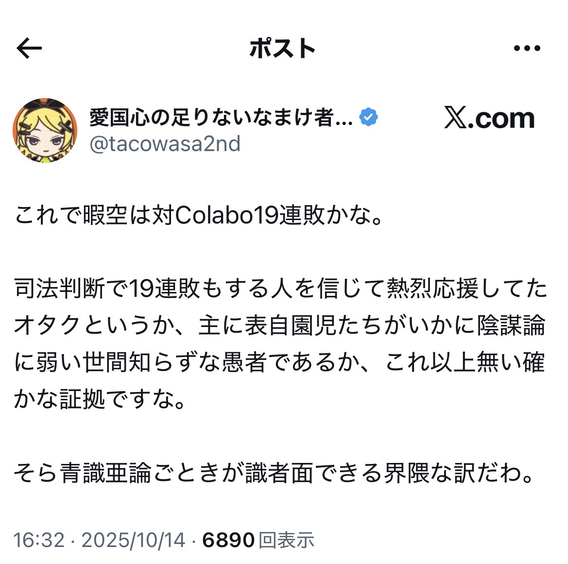 「暇空や青識くらいの取り返しのつかないレベルのオタになると、軍師どころかこの世のあらゆることの善悪の判断や物事の優先順位を自分がジャッジする立場にいると思ってる。