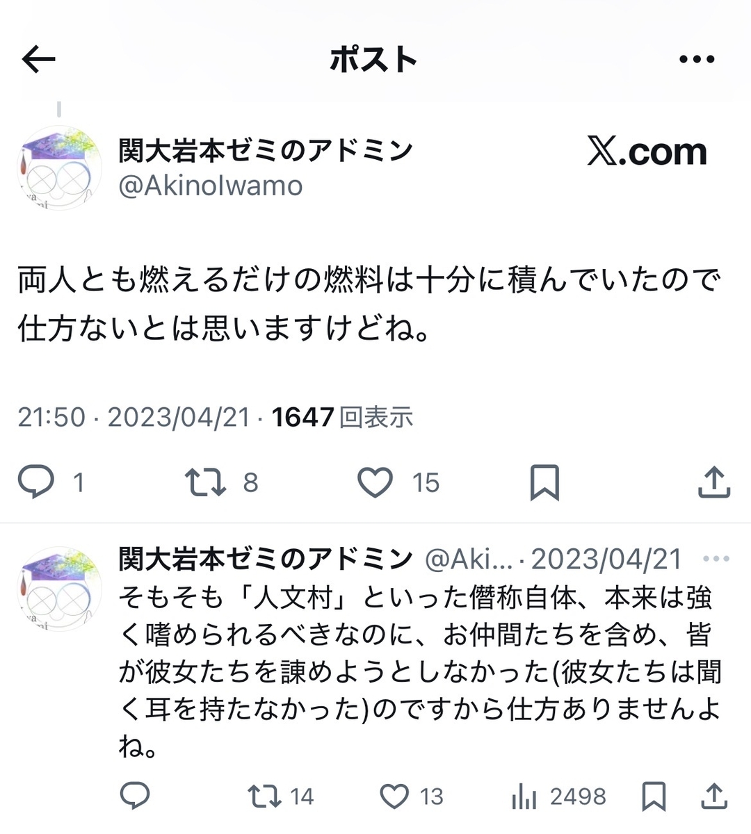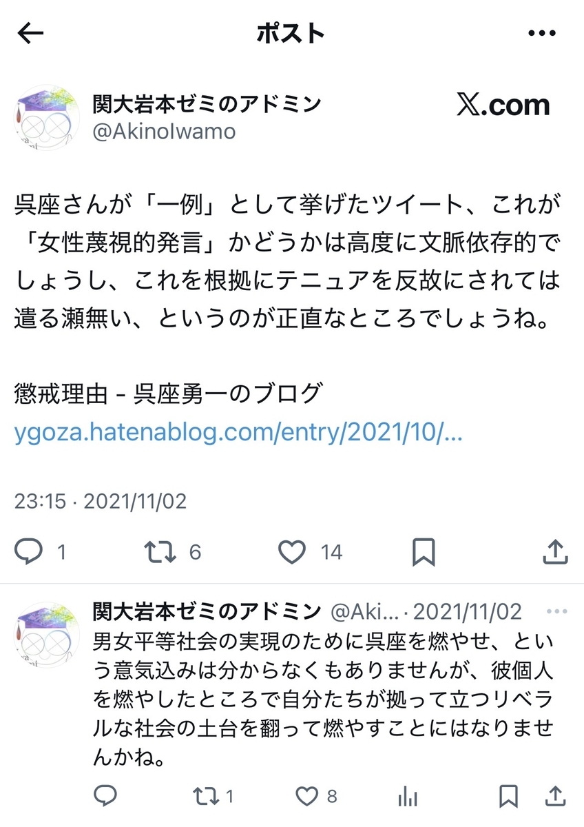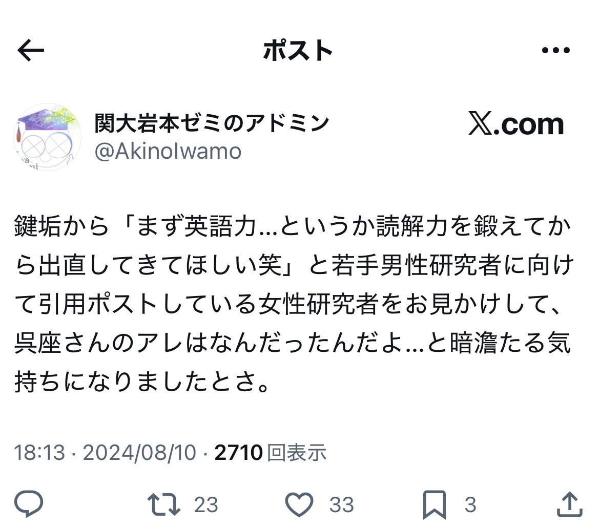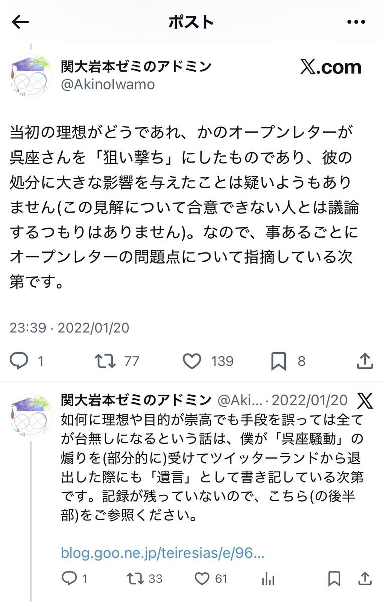 今後の焦点の一つは、身も蓋も無く言えば、掃討戦であり、残党狩りであり、戦国時代風に言うならば「落ち武者狩り」だと考えられますが……恐縮ながら、当ブログでは、一度でも反オープンレターズ側での「参戦」が確認された垢や有識者、とりわけアカデミシャンについては、一人、一人、いっそ三条河原にでも晒していく意気込みで取り組んでいきます。