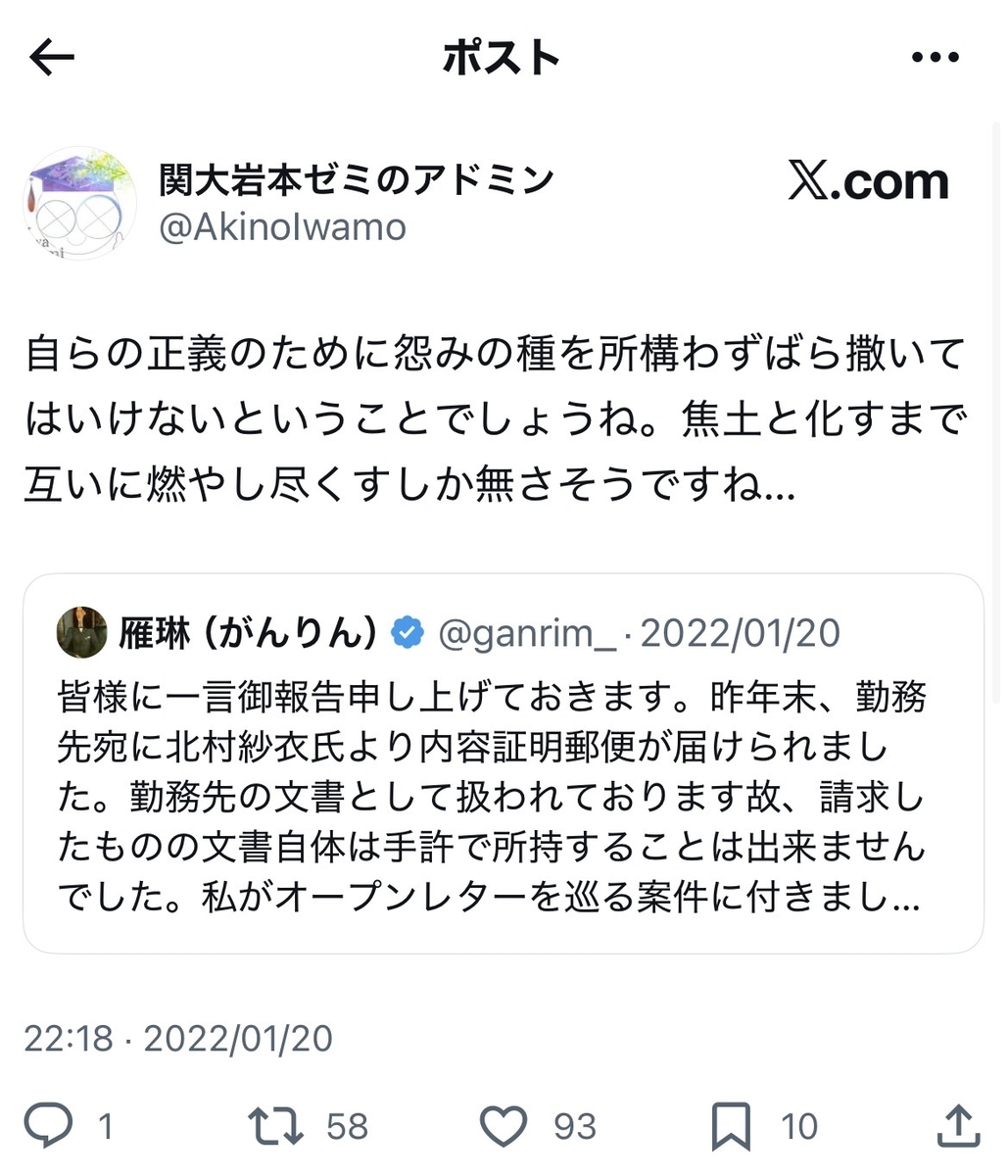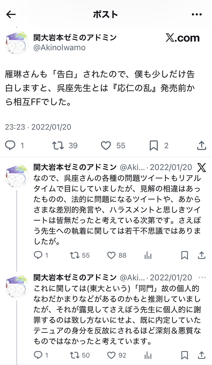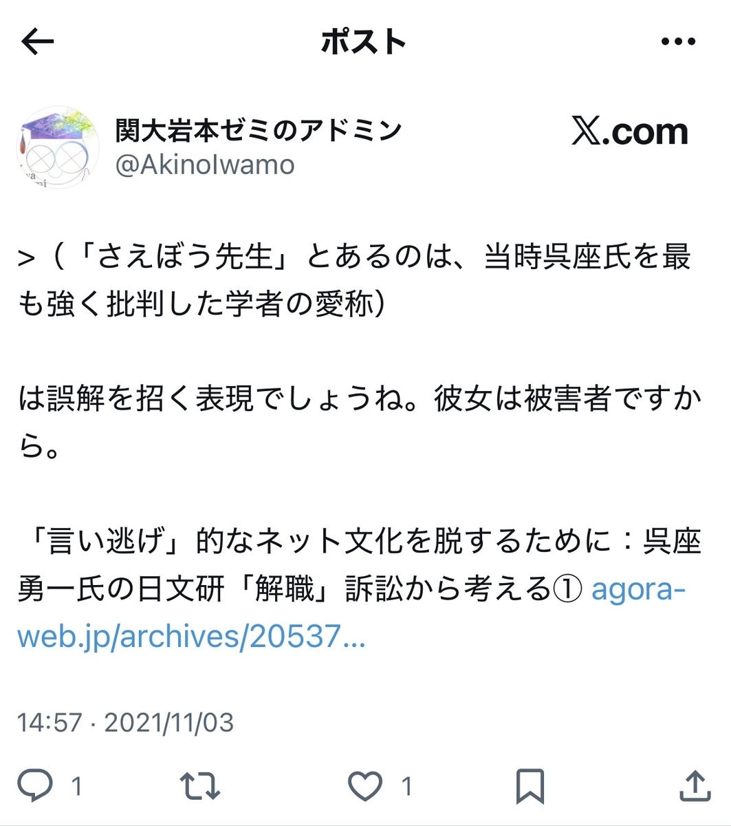 いずれにせよ、呉座氏が「主張」を取り下げて「敗北的和解」(実質敗訴)に踏み切ったのは……オープンレターと日文研から喰らった処分との間で、何らかの因果関係が成立するという旨のご自身の「主張」こそ、無理筋であった可能性を、事実上認めざるを得なかった結果でもあると考えますが。