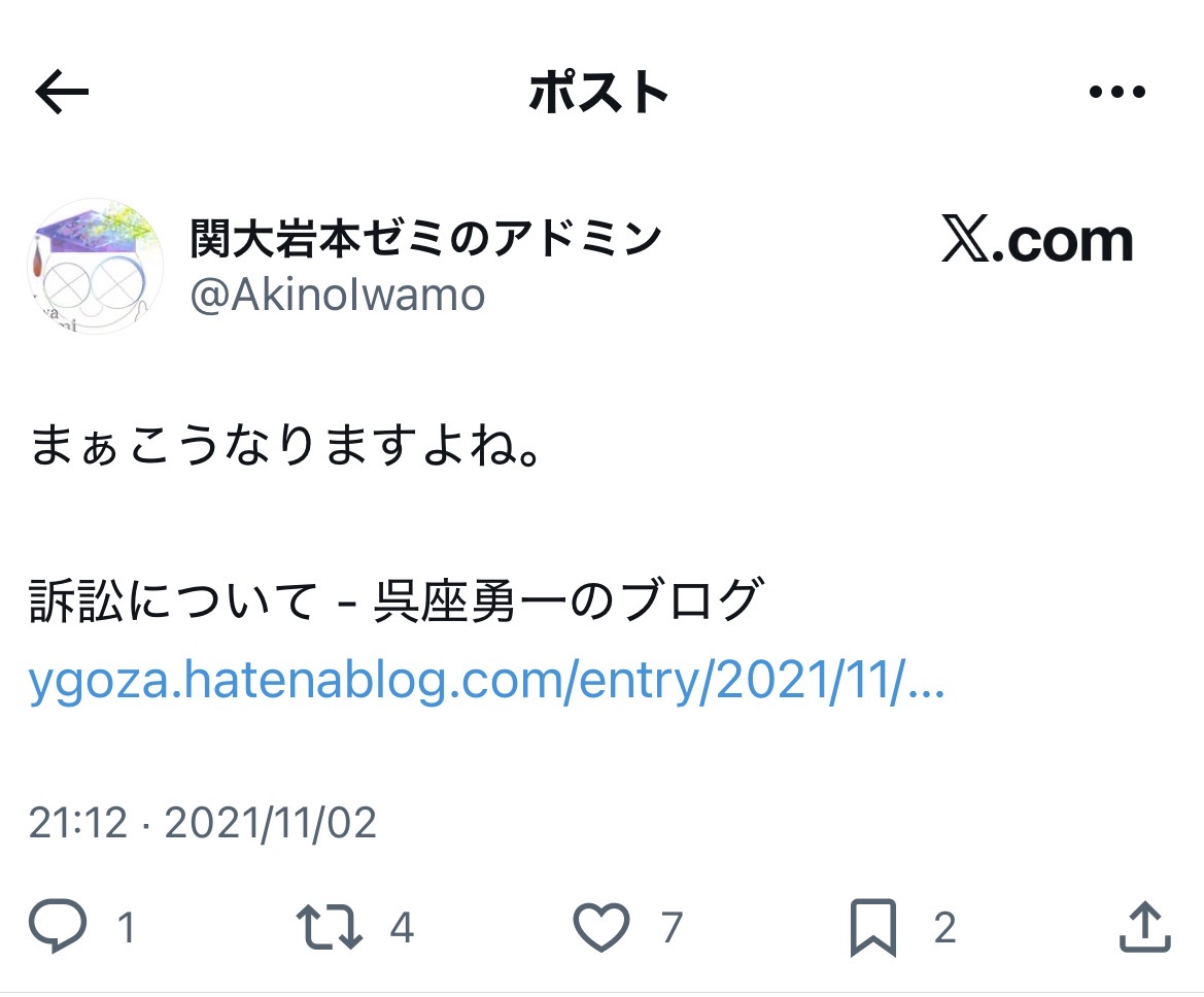 歴史学者の呉座勇一氏に関し、日本歴史学協会が、「歴史研究者による深刻なハラスメント行為を憂慮」する旨の声明を出した件で、呉座氏が協会を訴えた名誉毀損訴訟。本日、最高裁は呉座氏の上告を棄却。