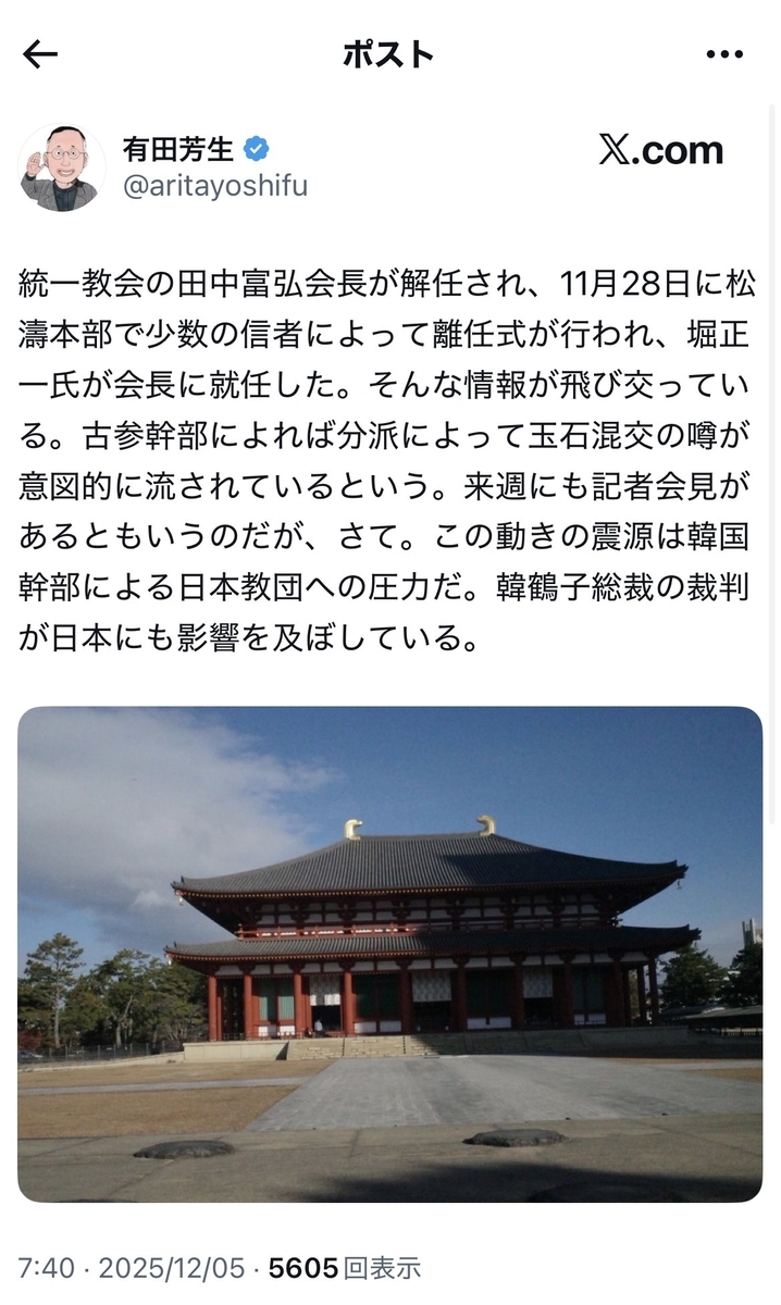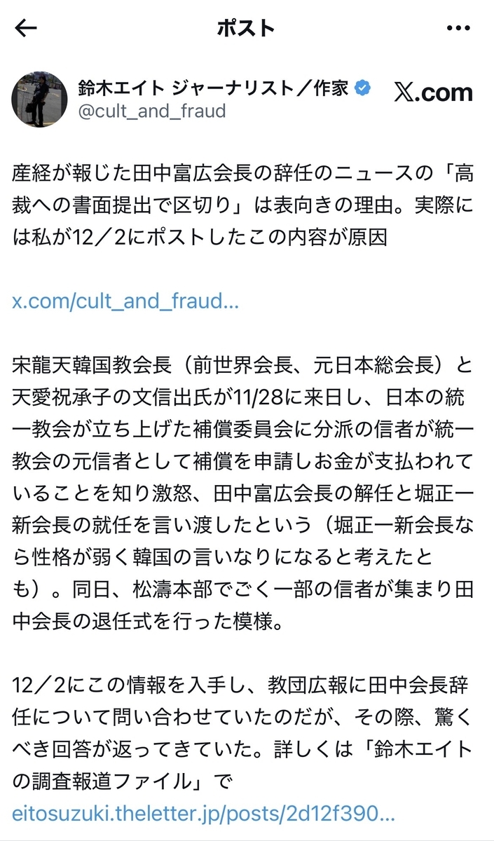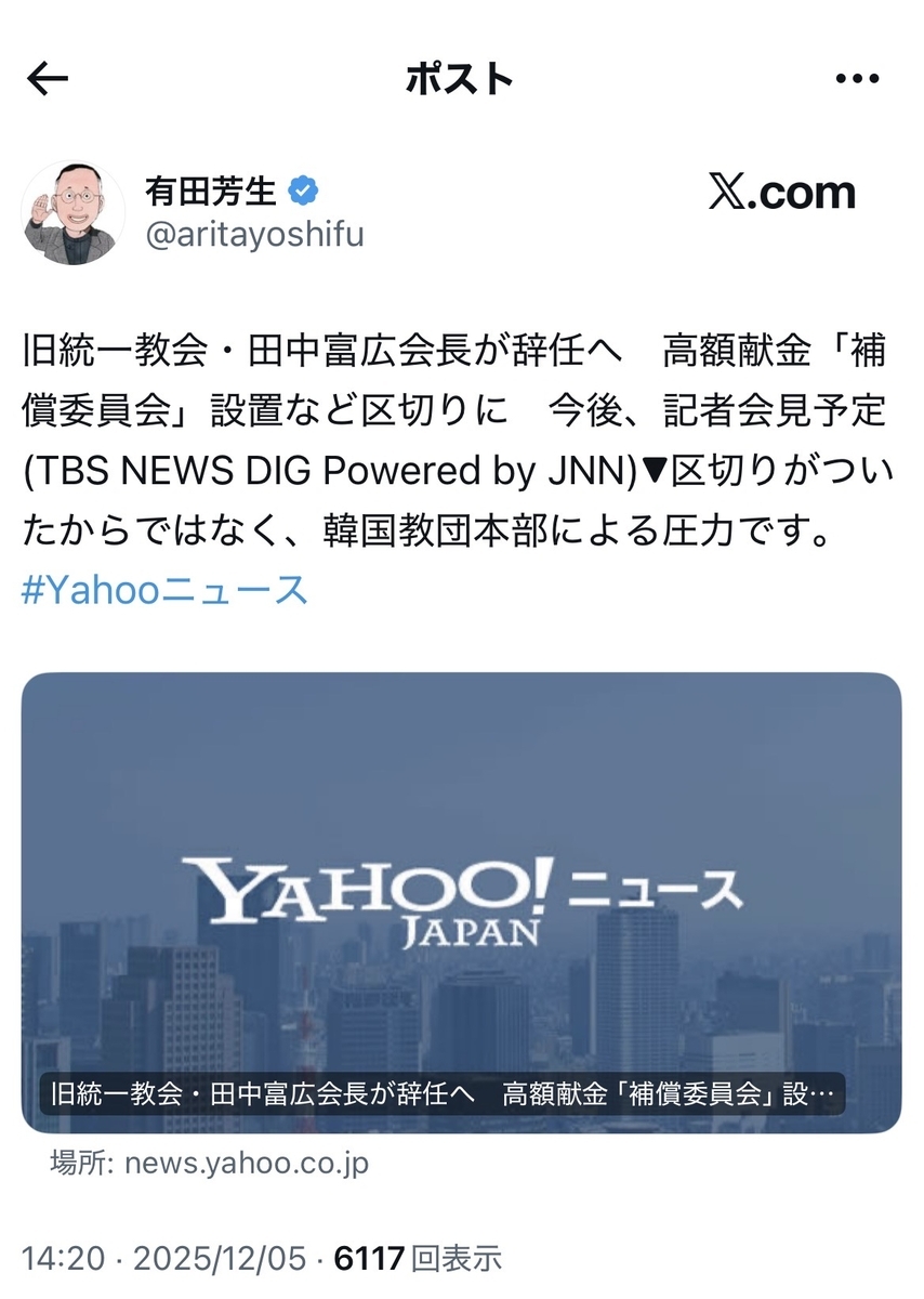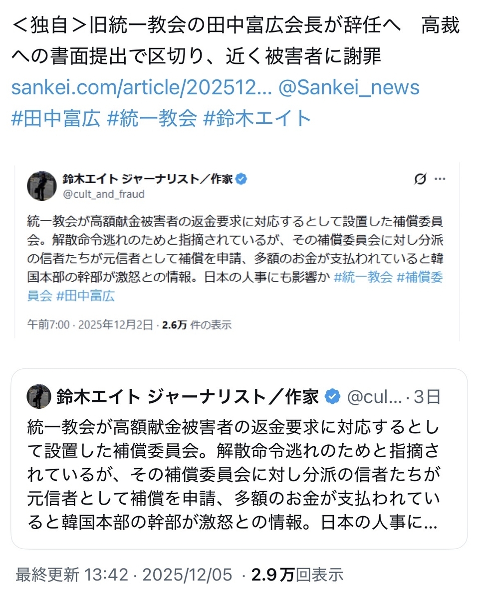 無論、韓鶴子総裁らの刑事裁判も始まる等、韓国本部自体からして、まさに風前の灯火ですが……本邦でも、日本本部の田中富広会長が来週、正式に辞任を表明するとのことだそうですが、実情は「解任」に近いそうです。